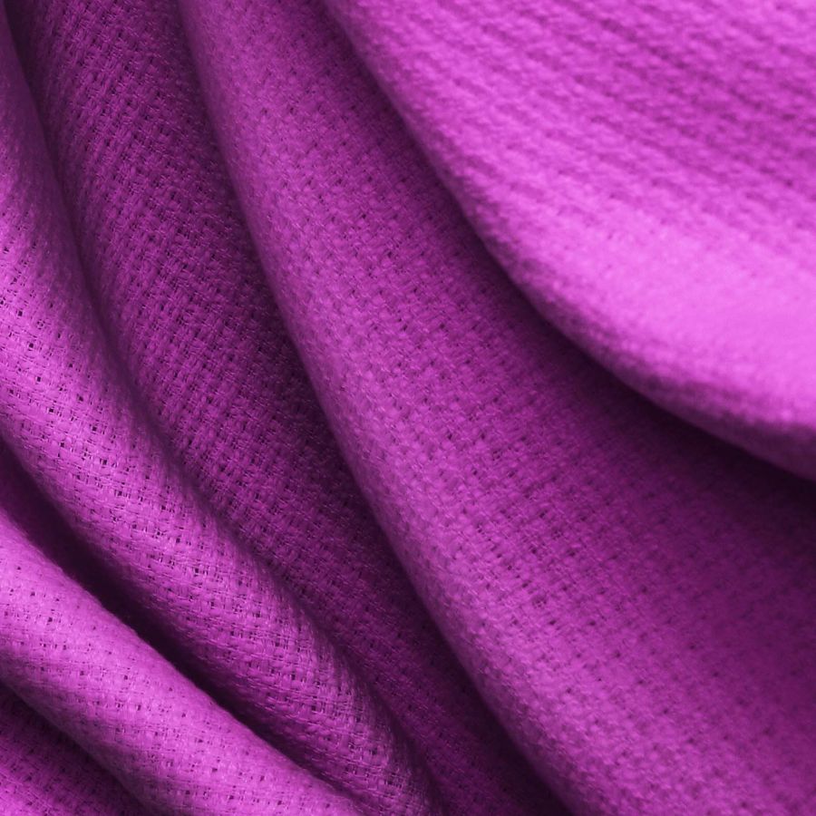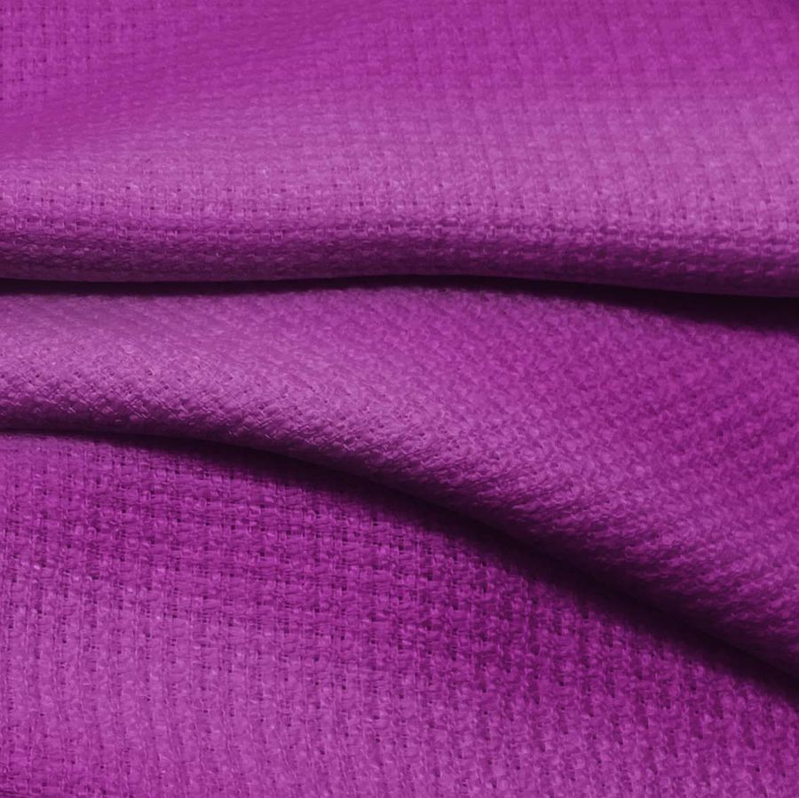 La tela base Tweed - Chanel, de composición 100% poliéster, presenta un gramaje de 420 gr/m2 y un ancho de 150 cm. El color liso impreso de esta tela es un tono morado o púrpura, cuyo contenido de tinta se compone de 54 de cian, 96 de magenta, 2 de amarillo y 0 de negro. Este color transmite elegancia y sofisticación, y combina especialmente bien con tonalidades grises y blancas, creando un contraste armónico y equilibrado.