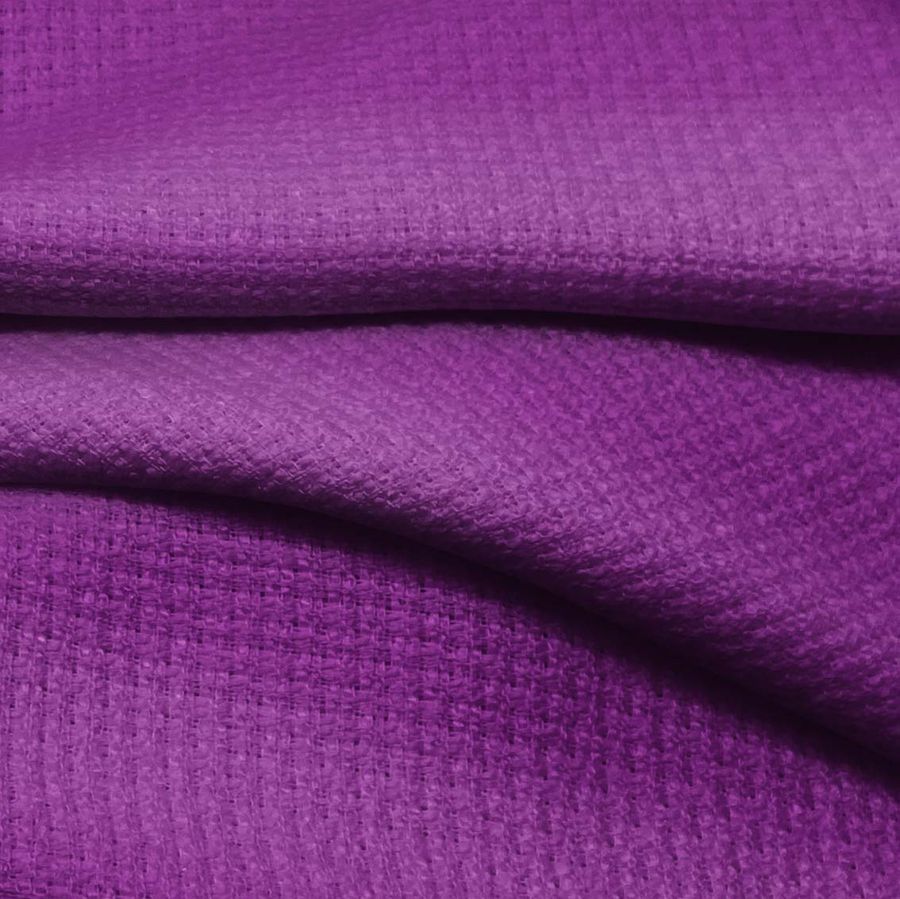 La tela base de este tejido es un Tweed - Chanel compuesto por 100% poliéster, con un gramaje de 420 gr/m2 y un ancho de 150 cm. El color liso impreso es Morado-Púrpura con una tinta cian del 65, magenta del 98, amarillo del 9 y negro del 2, lo que representa una mezcla de tonalidades vibrantes y sobrias. Este color está en consonancia con las últimas tendencias en moda y decoración.
