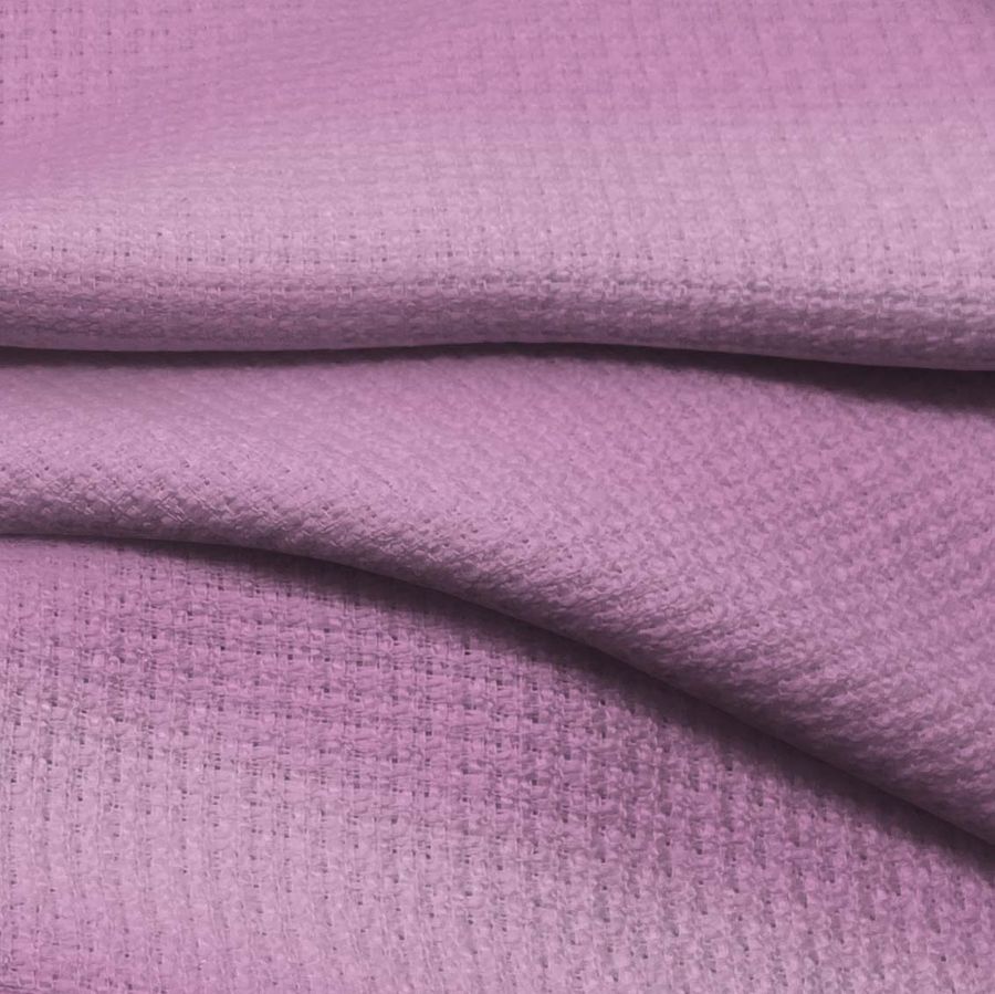 La tela base de Tweed - Chanel es de tipo tweed, compuesta por 100% poliéster y con un gramaje de 420 g/m2 y un ancho de 150 cm. El color liso impreso es de un tono morado ciruela, combinando una tinta cyan de 24, una tinta magenta de 53, una tinta yellow de 5 y sin tinta negra (CMYK 24 53 5 0). Este tono representa una sensación de lujo y sofisticación, así como un toque de misterio y elegancia. Se combina bien con tonalidades neutras como el blanco, negro y gris, así como con colores fuertes como el verde esmeralda y el azul oscuro.
