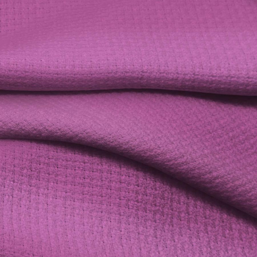 La tela base es un Tweed - Chanel, compuesta al 100% de poliéster y con un gramaje de 420 gr/m2. Su ancho es de 150 cm y su color liso impreso es de un tono morado orquídea mediana, cuyo CMYK es 34 75 6 0. Este color es un tono vibrante y elegante que evoca la feminidad y la sofisticación. Es un color que combina muy bien con tonos neutros como el gris o el negro, así como con tonos más vivos como el rosa o el verde menta.