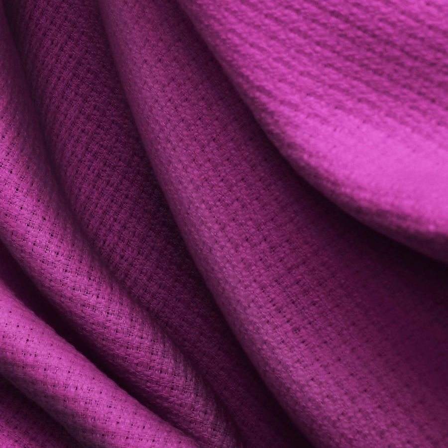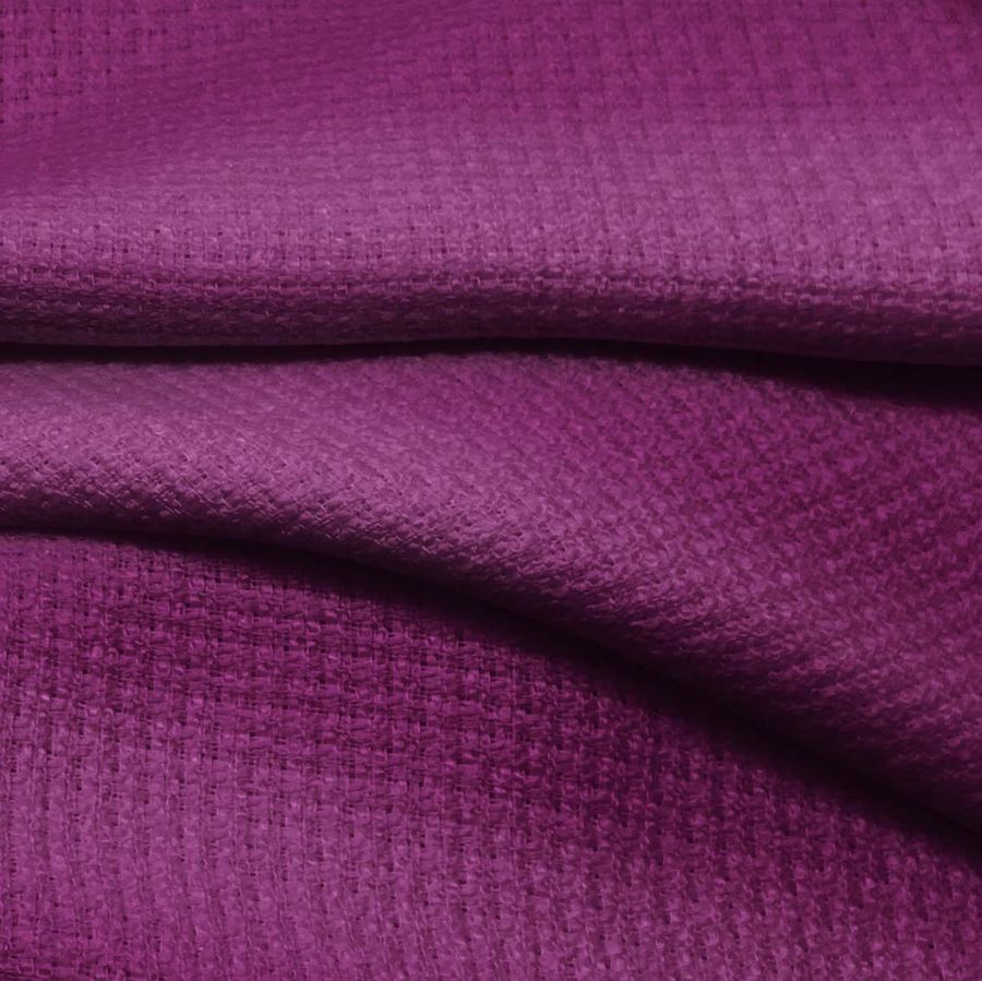 La tela base de este tejido es el Tweed - Chanel, un tipo de tela tweed compuesta al 100% de poliéster con un gramaje de 420 gr/m2 y un ancho de 150 cm. El color liso impreso es un hermoso morado berenjena con un CMYK de 58 100 29 27. Este color secundario se describe como misterioso, sofisticado y elegante. Cuando se combina con otros colores, se puede utilizar con tonos neutros como el beige, el gris o el blanco para crear un estilo minimalista, o con tonos cálidos como el amarillo o el naranja para hacerlo más vibrante.