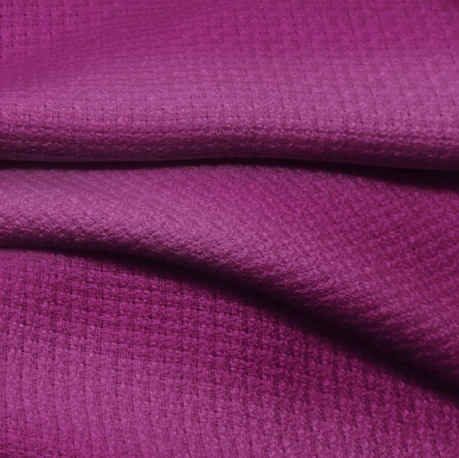 La tela base Tweed — Chanel es un tejido de tweed con una composición de 100% poliéster y un gramaje de 420 gr/m2. Su ancho de 150cm y su cuidado delicado lo hacen ideal para prendas de moda como chaquetas, abrigos, faldas, vestidos, shorts, y pajaritas. Esta tela luce un color liso impreso de un tono morado-berenjena con una combinación de tinta Cyan 53, Magenta 99, Yellow 25 y Black 18 (CMYK 53 99 25 18). La impresión digital textil en una sola cara asegura una calidad y un acabado excelente.