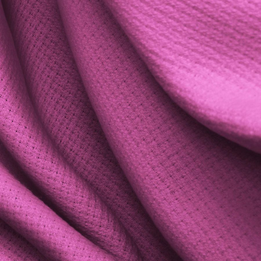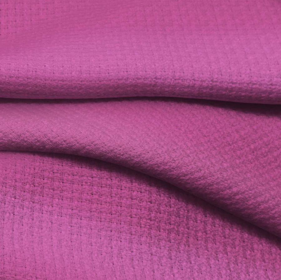 La tela base, Tweed - Chanel, está compuesta por un 100% de poliéster, con un gramaje de 420 gr/m2 y un ancho de 150 cm. El color liso impreso en esta tela es un rosa clavel oscuro, que se consigue gracias a una combinación de tintas Cyan, Magenta y Yellow, con un porcentaje más alto de Magenta que de Cyan o Yellow y un 0% de Black. Este color liso combina perfectamente con tonos grises y beige.