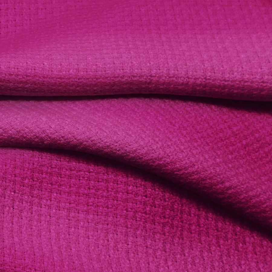 La tela base de este producto es Tweed - Chanel, compuesta al 100% por poliéster con un gramaje de 420 gr/m2 y ancho de 150 cm. En cuanto al color liso, se trata de un morado ciruela con un CMYK de 34 100 21 13. Este color es simbólicamente asociado con la sofisticación y el encanto, además técnicamente es un color que combina bien con otros tonos oscuros como el negro, marrón o gris. Es importante destacar que la tela base está impresa con el color liso a una sola cara por impresión digital textil, lo que significa que se trata de un tejido impreso y no tintado.