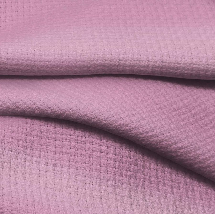 La tela base, tweed Chanel, es un tejido de poliéster con un gramaje de 420 gr/m2 y un ancho de 150 cm. El color liso impreso en esta tela es rosa Cadillac, con una combinación CMYK de 15 50 9 0. Este color secundario es un tono pastel suave y elegante que evoca sensaciones de tranquilidad y armonía. Además, se combina perfectamente con colores claros como blanco, beige y gris claro, así como con tonos más fuertes como azul oscuro y verde esmeralda.