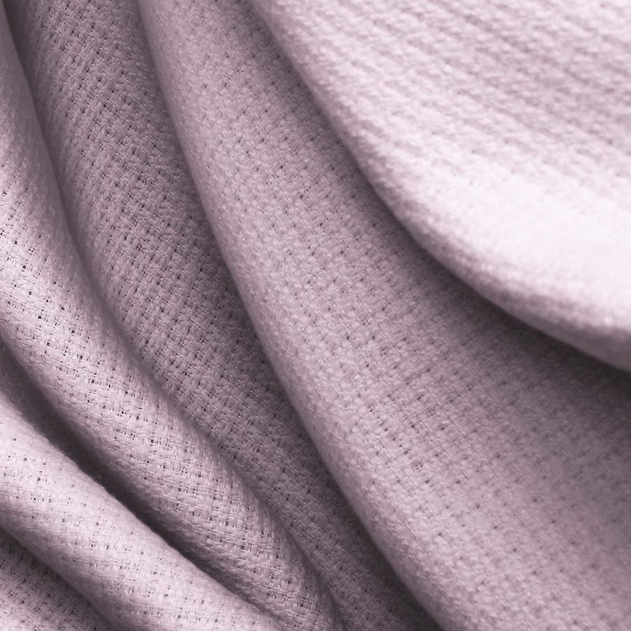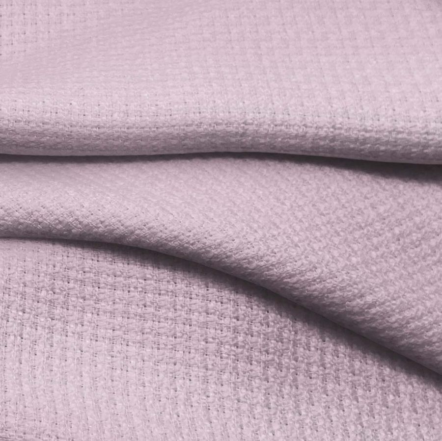 Cabe destacar que el tejido está impreso con el color liso a una sola cara por impresión digital textil, lo que significa que no es un tejido tintado sino impreso por una única cara. En cuanto a las características generales, tanto de la tela base como del color liso, destaca que el tweed chanel tiene una textura rígida al tacto. Por otro lado, el color rosa cerdo impreso tiene un acabado mate.