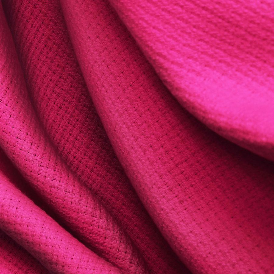 La tela base es Tweed - Chanel, un tejido de alta calidad compuesto al 100% de poliéster con un gramaje de 420 gr/m2 y un ancho de 150 cm. El color liso impreso es rosa rojo con un CMYK de 20 100 52 12, lo que representa un tono vibrante e intenso. Este color secundario equilibra la dulzura del rosa con una pizca de pasión y vitalidad. Además, combina perfectamente con colores neutros como el blanco, negro o gris para un look elegante o con tonos terrosos para un estilo más rústico.