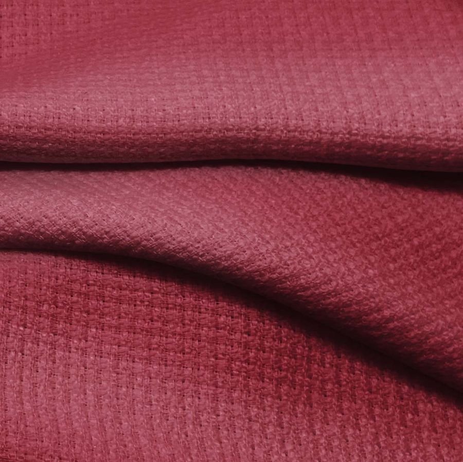 La tela base es un tweed de poliéster de 420 gramos por metro cuadrado, con un ancho de 150 cm. Su color liso impreso es rojo borgoña, con un CMYK de 29 86 56 32, lo que representa una gama cálida y elegante. El rojo borgoña se caracteriza por ser un color secundario entre el rojo y el morado, lo que lo hace impactante y sofisticado. Este color combina especialmente bien con tonos marrones, tierra y dorados, contribuyendo a un aire vintage y elegante que se adapta a muchos tipos de prendas.