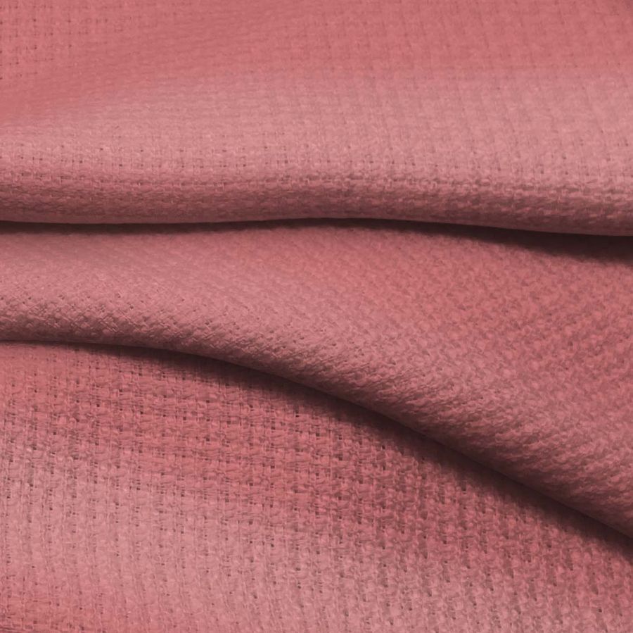 La tela base de este tejido es un tweed Chanel, compuesto de 100% poliéster con un gramaje de 420 gr/m2 y un ancho de 150 cm. El color liso impreso es rosa sandía, con un CMYK de 16 64 44 4. Este color, simbólicamente, transmite alegría y vitalidad. Técnicamente, se trata de un color con tonos cálidos y fuertes, que combina muy bien con otros colores vivos como el amarillo o el naranja. Cabe destacar que este tejido está impreso con el color liso a una sola cara por impresión digital textil, lo que permite una gran calidad de imagen y detalles precisos.