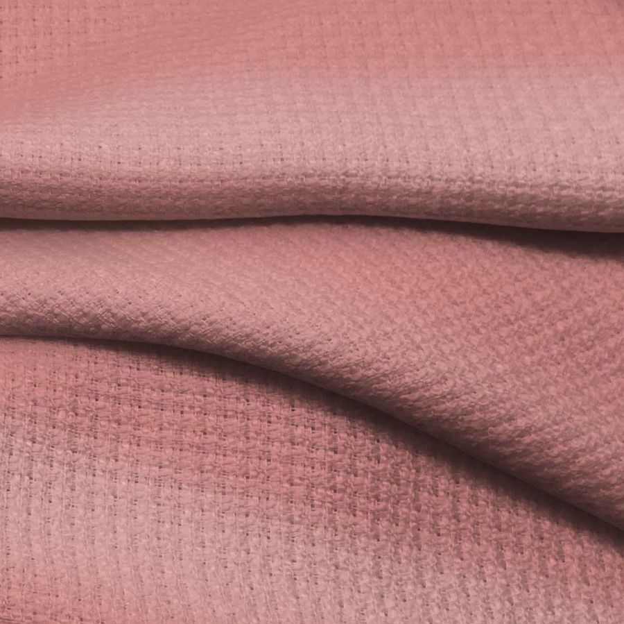 La tela base es el Tweed - Chanel, una tela rígida de composición 100% poliéster con un gramaje de 420 gr/m2 y un ancho de 150 cm. El color liso impreso es un rosa margarita con un CMYK de 14 53 40 3. Este color tiene una simbología que evoca el optimismo, la energía y la creatividad, y técnicamente es un color secundario formado por la mezcla de tonos de color cian, magenta y amarillo. Es un color que se combina especialmente bien con tonos de gris y negro, así como con tonos de verde musgo, naranja oscuro y marrón.