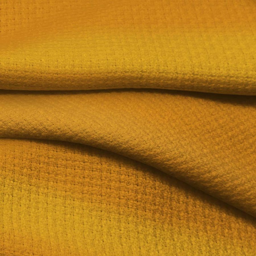 La tela base es Tweed - Chanel, un tejido fuerte y resistente de 420 gr/m2 compuesto por 100% poliéster. El color liso impreso es Naranja, con un CMYK de 14 52 96 3, lo que indica una combinación de tintas cian, magenta, amarillo y negro. Este color secundario simboliza la creatividad, la vitalidad y la humildad. En particular, combina muy bien con tonos tierra, rojos y amarillos pálidos. Es importante destacar que la tela está impresa con el color liso a una sola cara por impresión digital textil.
