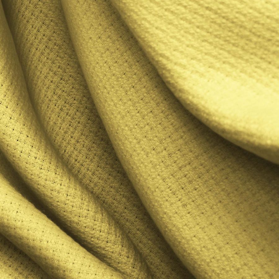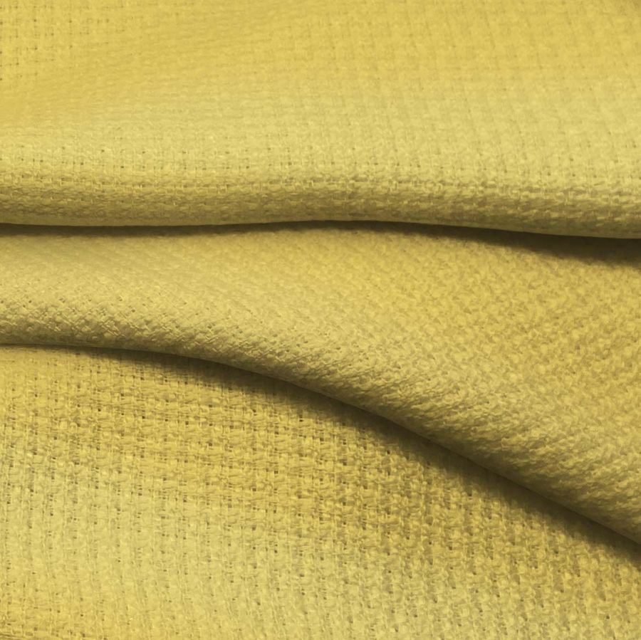 La tela base es Tweed-Chanel, con una composición de 100% poliéster y peso de 420 gr/m2. El color liso impreso es un vibrante tono de amarillo oro brillante, con un CMYK de 9 18 71 0. El color secundario es el magenta, que le aporta profundidad y calidez al amarillo. Además, combina muy bien con tonos tierra, grises y blancos. La tela está impresa con el color liso a una sola cara mediante impresión digital textil.
