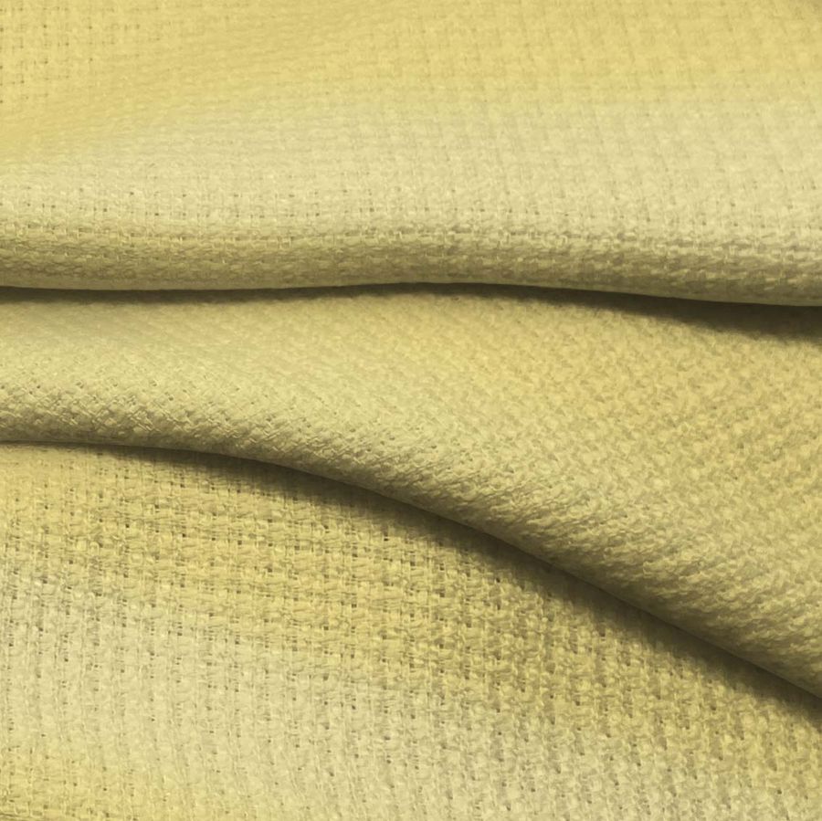 La tela base del tejido es un tweed de composición 100% poliéster con un gramaje de 420 gr/m2 y un ancho de 150 cm. Este tweed presenta una textura rígida y un tacto áspero al tacto, lo que le aporta una sensación de robustez y firmeza. Su color liso impreso es amarillo sol, con un CMYK de 6 11 58 0, lo que le otorga un matiz cálido y brillante. Este color se combina a la perfección con tonos marrones y beige, y también con el blanco y el negro, lo que permite una gran variedad de combinaciones cromáticas.
