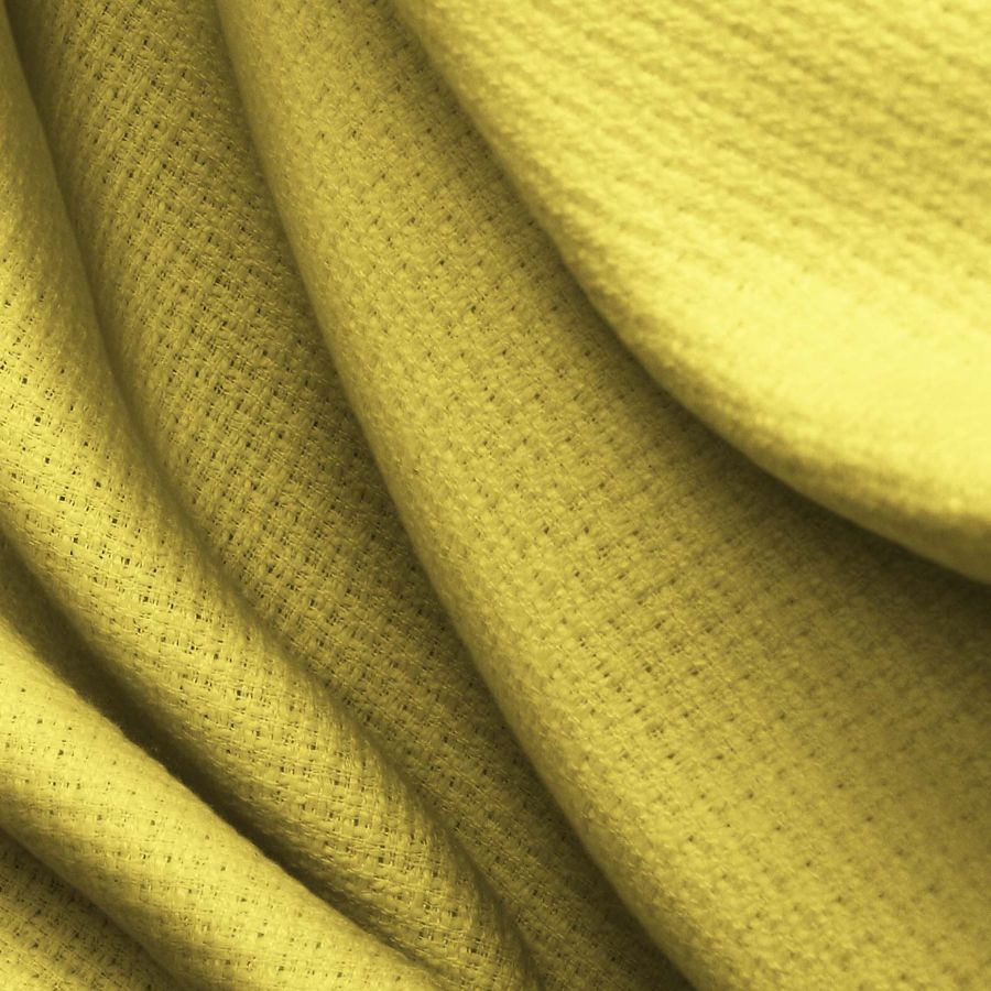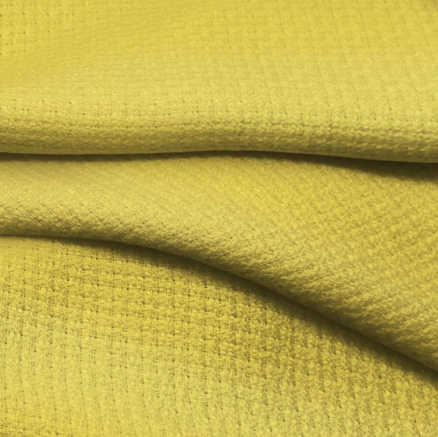 La tela base es el Tweed - Chanel, compuesta de 100% poliéster con un gramaje de 420 gr/m2 y un ancho de 150 cm. El color liso impreso es un amarillo patito de goma, con la siguiente composición en CMYK: 7 14 76 0. Este color es simbólico de la alegría, el optimismo y la energía juvenil, mientras que técnicamente se define por su alta saturación y brillo. Combina particularmente bien con tonos neutros como grises y blancos.
