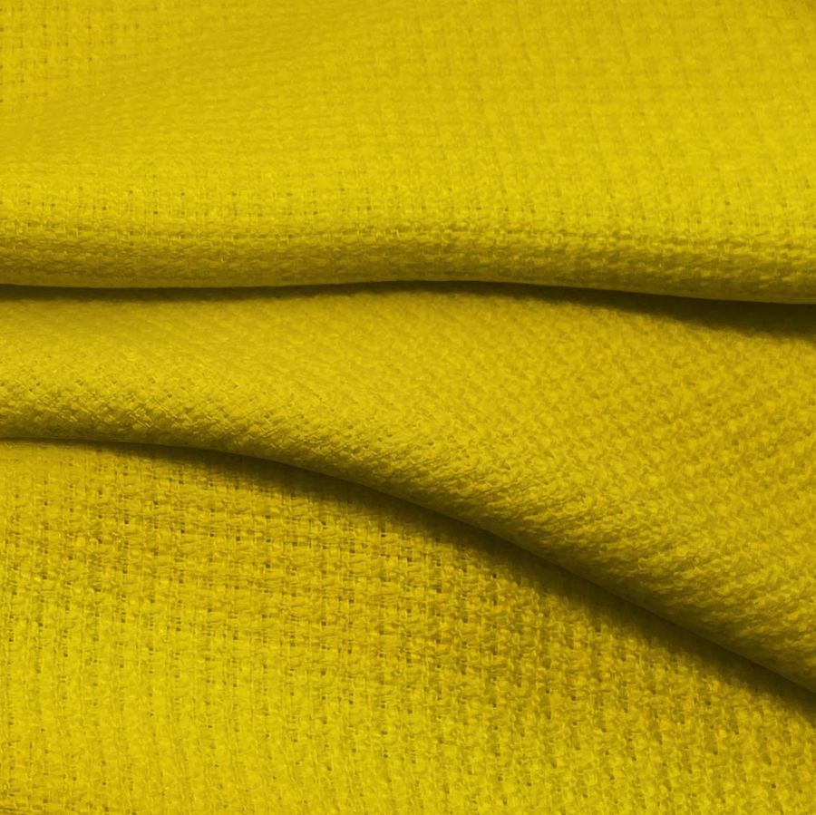 La tela base es el Tweed - Chanel de 100% poliéster con un gramaje de 420 gr/m2 y un ancho de 150 cm. El color liso impreso es un amarillo profundo con los siguientes valores de tinta CMYK: 13 25 96 2. Este color es intenso y vibrante, y se complementa particularmente bien con tonos cálidos como el rojo y el naranja, así como con tonos fríos como el verde y el azul.