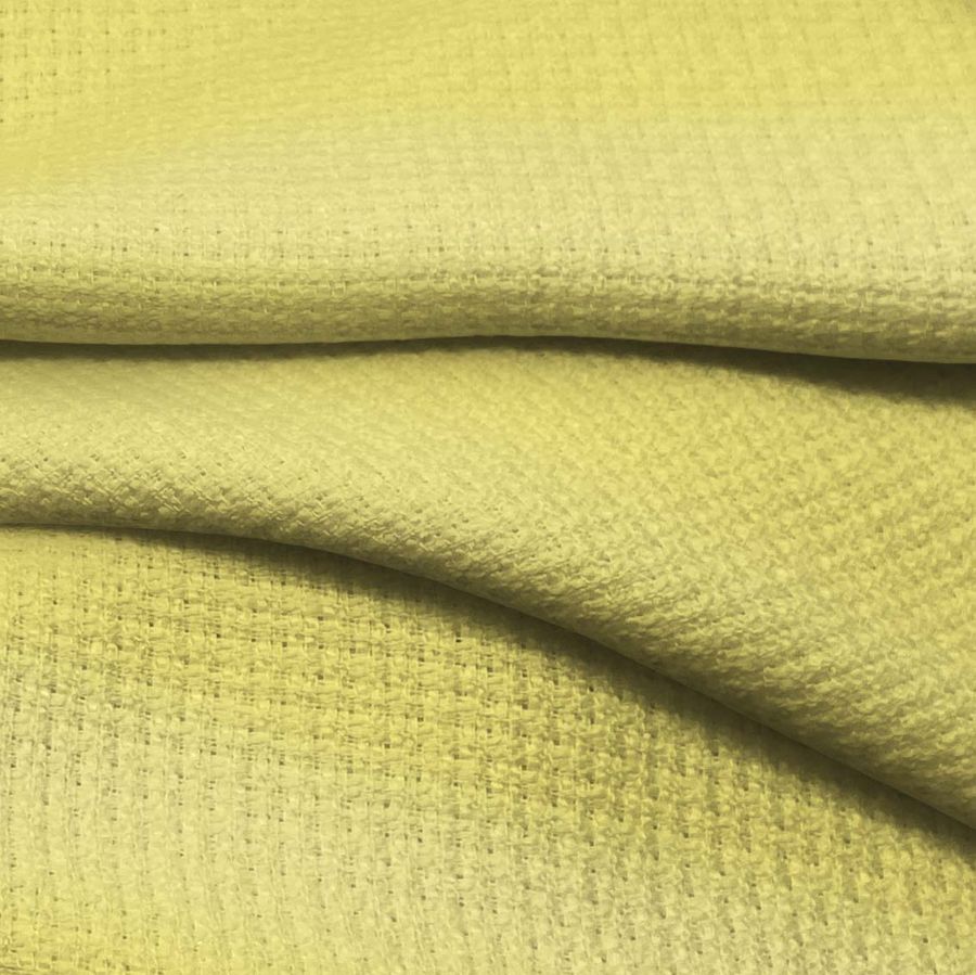 La Tweed-Chanel es una tela de tipo tweed, compuesta al 100% por poliéster. Su gramaje es de 420 gr/m2 y su ancho alcanza los 150 cm. El color liso impreso es un amarillo maíz con una combinación de tintas de 4 de cian, 3 de magenta, 64 de yellow y 0 de negro, reflejando la vibrante frescura del color de maíz recién cosechado. Este tono equilibrado ofrece una cierta sofisticación al amarillo, siendo combinable con tonos más oscuros, como grises, marrones y negros, así como con tonos más claros, como el blanco, el beige y el crema. Es importante tener en cuenta que esta tela está impresa con color liso en una sola cara, utilizando tecnología de impresión digital textil.