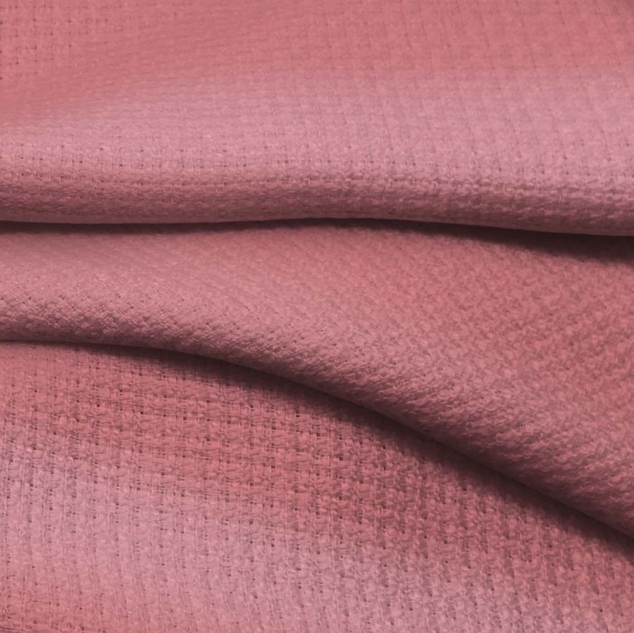 La tela base, Tweed - Chanel, es de tipo tweed y está compuesta por 100% poliéster con un gramaje de 420 gr/m2 y un ancho de 150 cm. Su color base es liso y tiene un impresionante tono rosa-arena del desierto con el CMYK de 16 61 39 4. Este color se describe por su tonalidad pastel suave con una delicada mezcla de rosa pálido y amarillo claro que evoca la calidez del desierto. Es un color que simboliza la felicidad, la ternura y la paz interior. Combina perfectamente con tonos naturales, como el blanco, el beige, el gris y el marrón claro, lo que lo hace ideal para la creación de looks delicados y sofisticados.