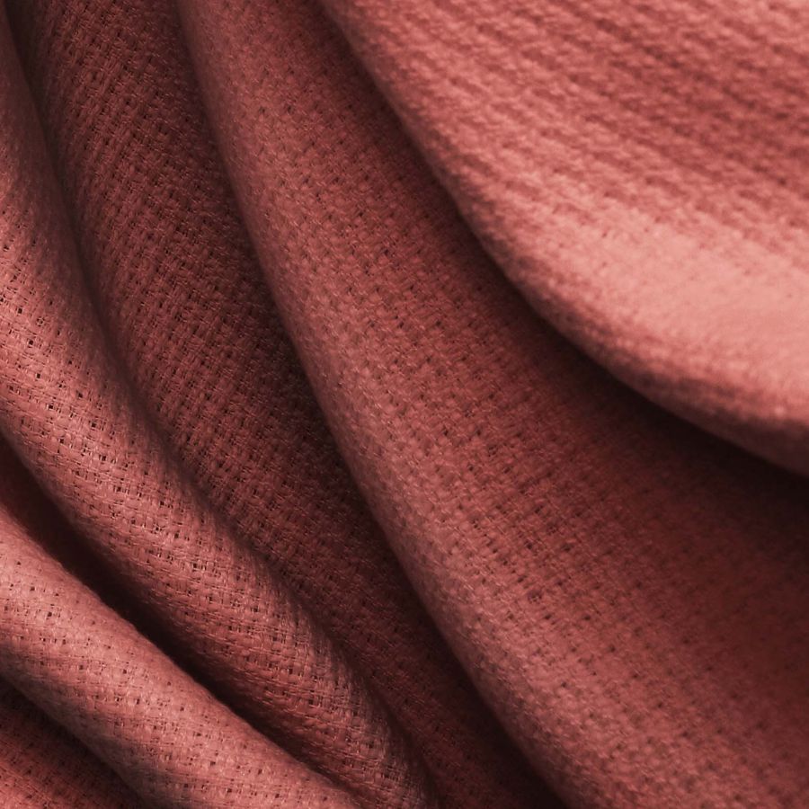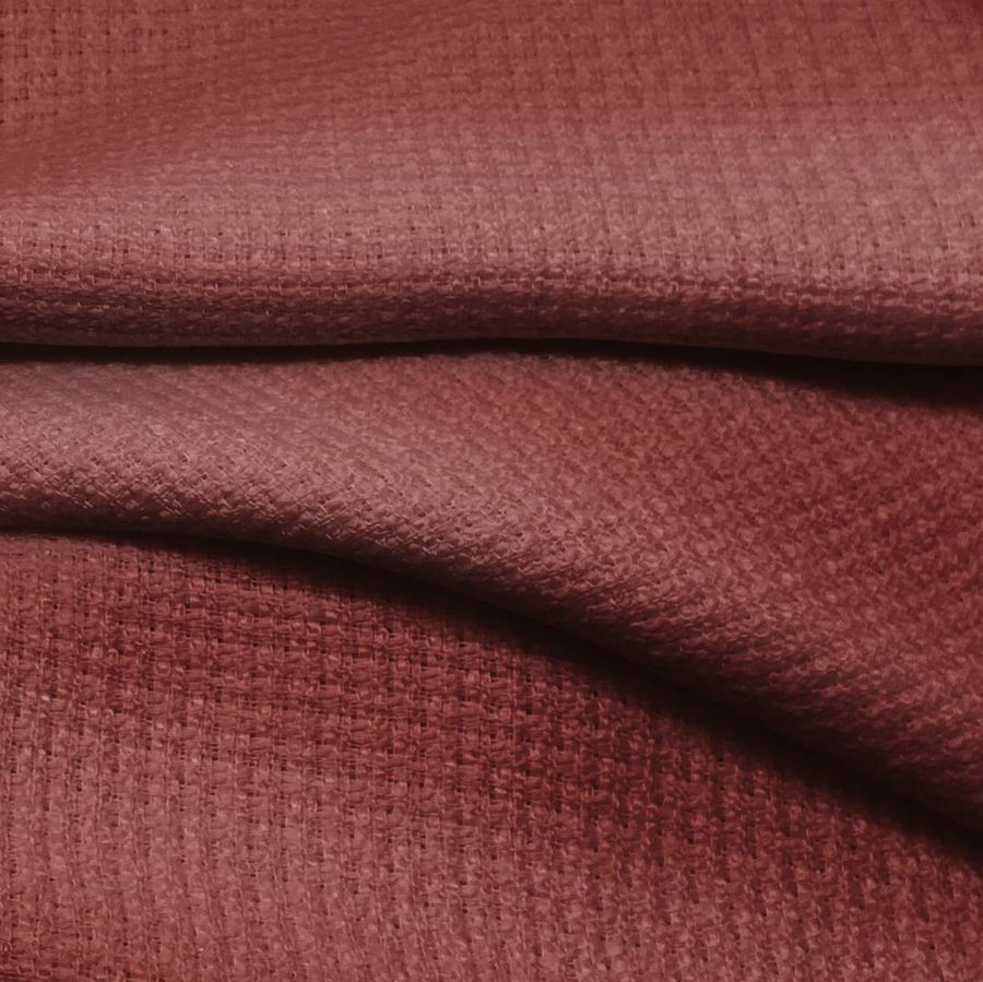 La tela base es el Tweed Chanel, compuesta al 100% por poliéster con un gramaje de 420 gr/m2 y un ancho de 150 cm. El color liso impreso es marrón con matices de sangre roja, cuya composición de tinta CMYK es de 34 77 67 44. Este color simboliza la estabilidad, fuerza y protección, y se combina especialmente con tonos dorados y cremas. Cabe destacar que la tela está impresa con este color liso a una sola cara por impresión digital textil.