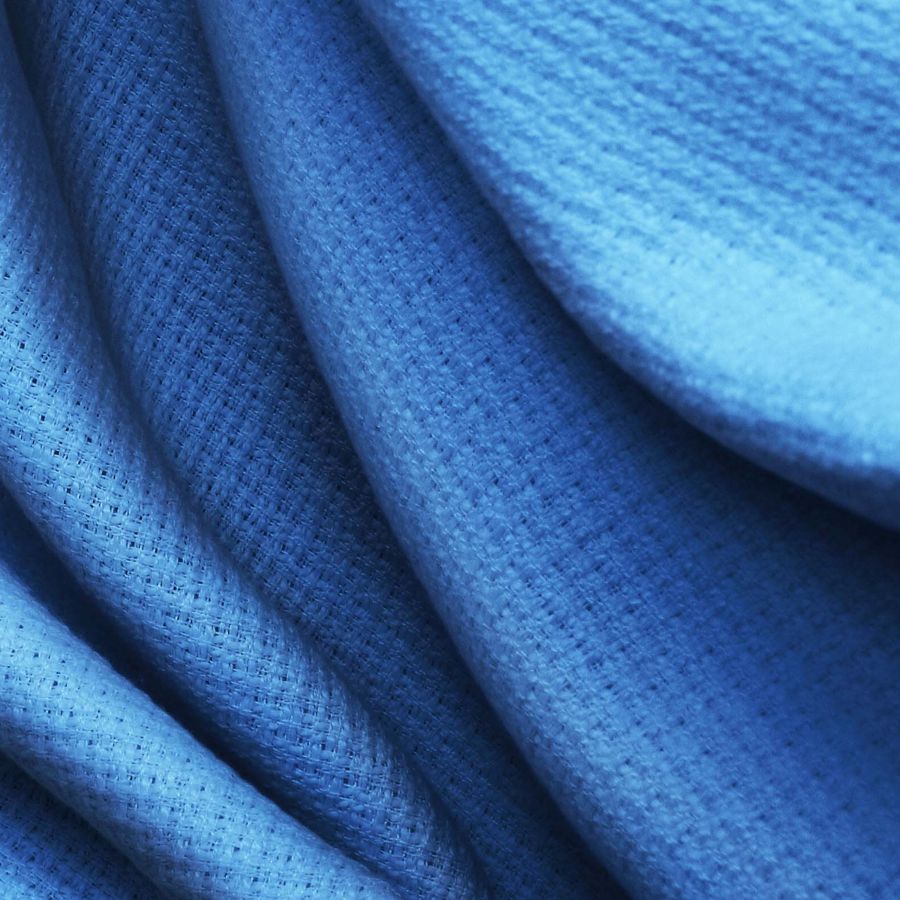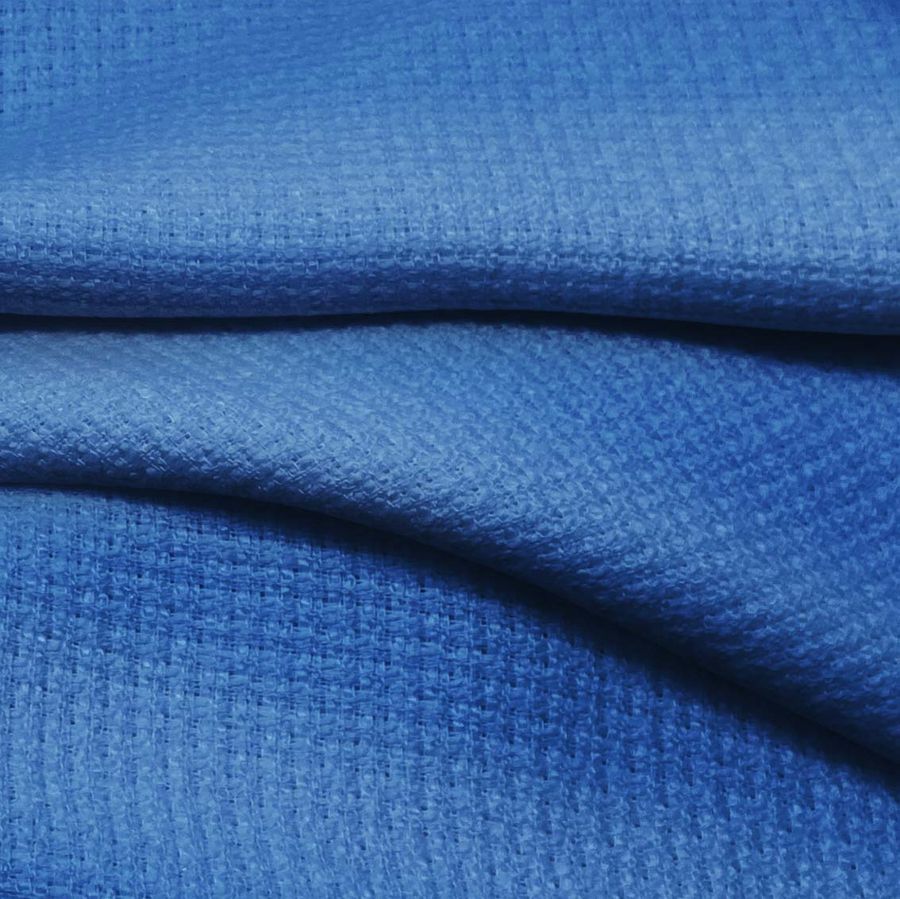 La tela base es un Tweed - Chanel 100% POLIÉSTER, con un gramaje de 420 gr/m2 y un ancho de 150 cm. El color liso impreso es Azul-Azul celeste con un CMYK de 85 59 5 0. Este color representa la tranquilidad y la serenidad, evocando la relajación y la renovación. El color secundario es un azul celeste, evocando la calma y la frescura que se combina perfectamente con el blanco y el gris, colores tranquilos y serenos.