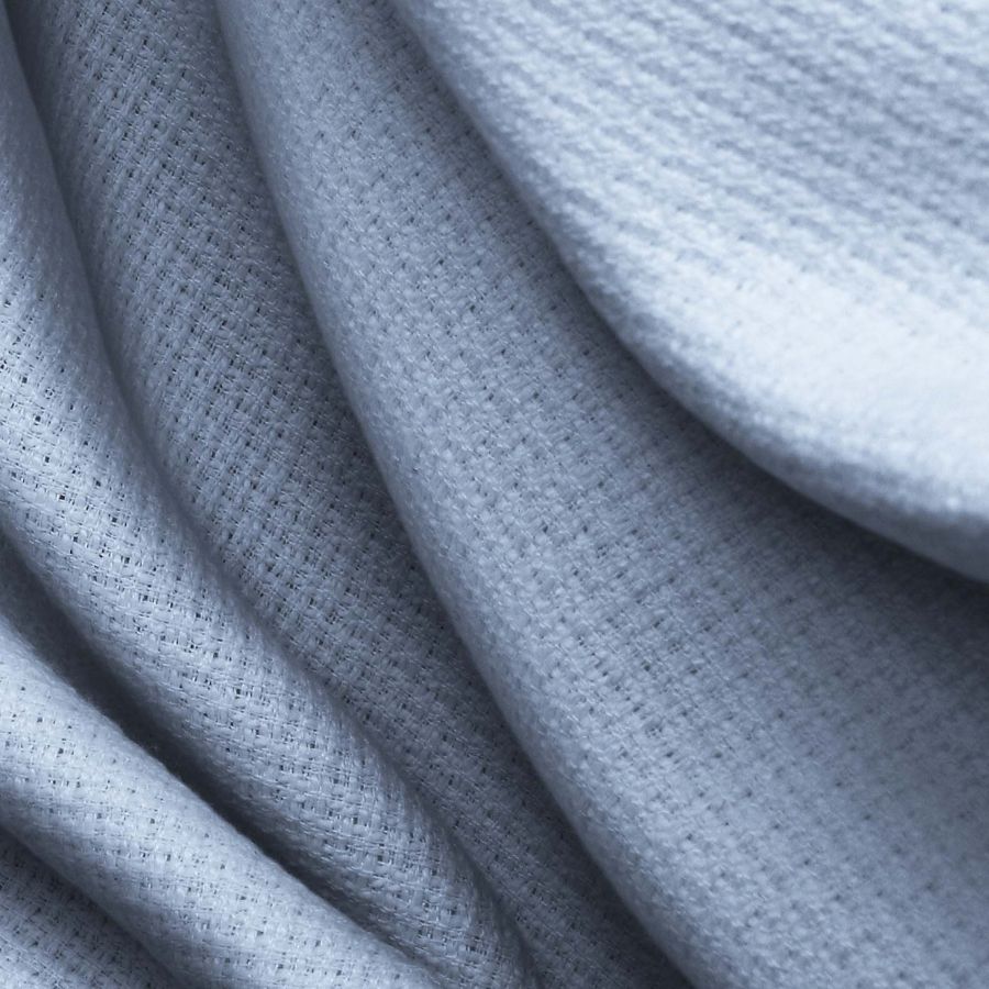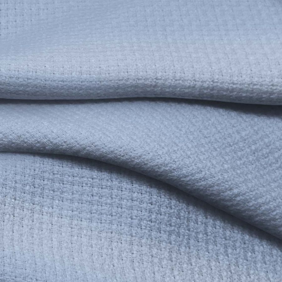 La tela base es Tweed-Chanel, compuesta por 100% poliéster con un gramaje de 420 gr/m2. El color liso impreso es Azul real con un CMYK de 42 23 5 0. Este color simboliza la confianza, la estabilidad y la lealtad, y técnicamente su tonalidad explosiva representa un balance entre el Azul y el Verde. Combina perfectamente con otros tonos de Azul, Gris claro y Blanco. Este tejido está impreso con el color liso a una sola cara por impresión digital textil.