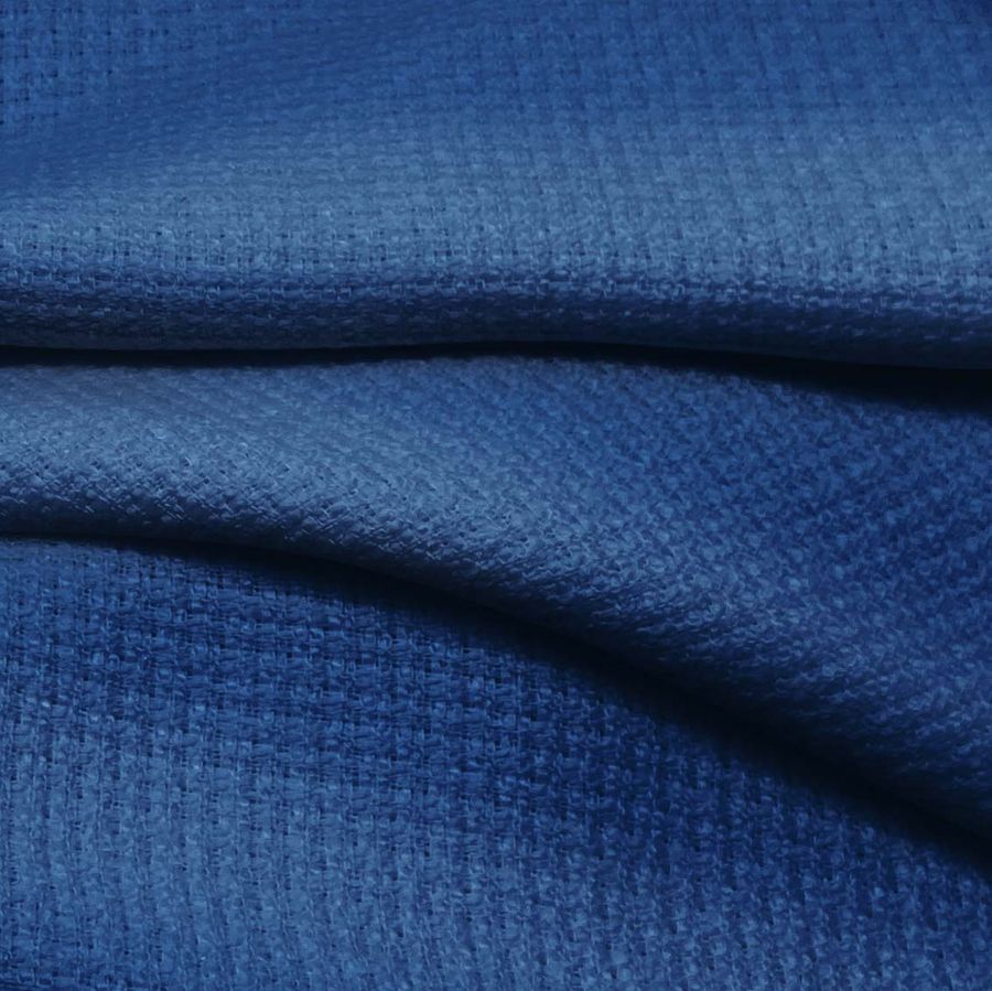 La tela base es un tweed chanel compuesto al 100% de poliéster, con un gramaje de 420 gr/m2 y un ancho de 150 cm. El color liso impreso es de un azul lapislázuli intenso, obtenido a través de la utilización de tinta con los valores de CMYK de 100, 79, 29 y 13 para las tintas Cyan, Magenta, Yellow y Black, respectivamente. Este color es un tono sobrio y elegante que aporta una personalidad única al tejido. Se trata de un color secundario que se combina perfectamente con otros tonos de azul oscuro, grises y blancos.