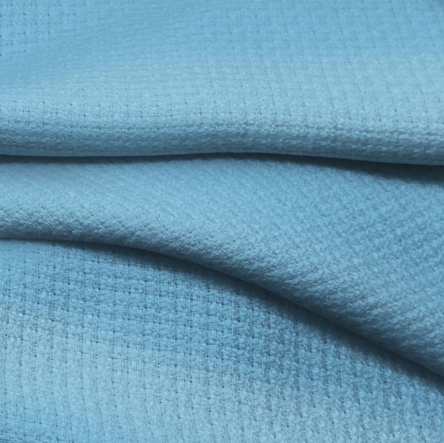 La tela base es el Tweed- Chanel, compuesta en un 100% de poliéster, con un gramaje de 420 gr/m2 y con un ancho de 150 cm. El color liso impreso es un azul iceberg, que se obtiene a través de la combinación de 56% de tinta cian, 13% de tinta magenta y 6% de tinta yellow, resultando en un CMYK de 56 13 6 0. Este color evoca la frescura y pureza de un iceberg, a la vez que sugiere la tranquilidad y serenidad del océano. Es una tonalidad que transmite un sentimiento de calma y relajación. Este color combina muy bien con tonos tierra, como el beige y el tostado, así como con tonos grisáceos y blancos.