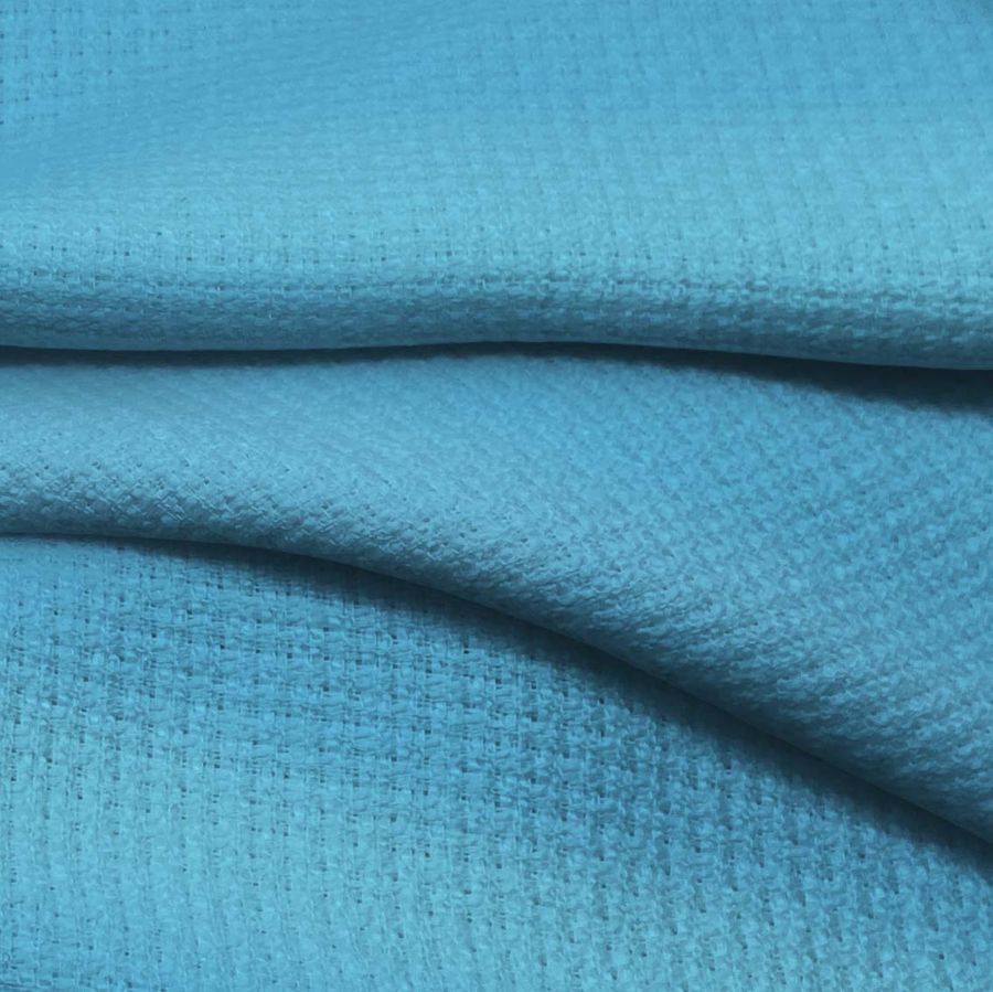 La tela base, Tweed - Chanel, se compone de 100% POLIÉSTER con un gramaje de 420 gr/m2. Su color liso impreso es Azul Mariposa con un CMYK de 65 16 8 0. Este color secundario se describe como una mezcla de los tonos elegantes de Azul Oscuro y Azul Claro, evocando sentimientos de serenidad, tranquilidad y frescura. Combina bien con colores blancos o negros pero también con tonos pasteles como el rosa palo o el gris claro.
