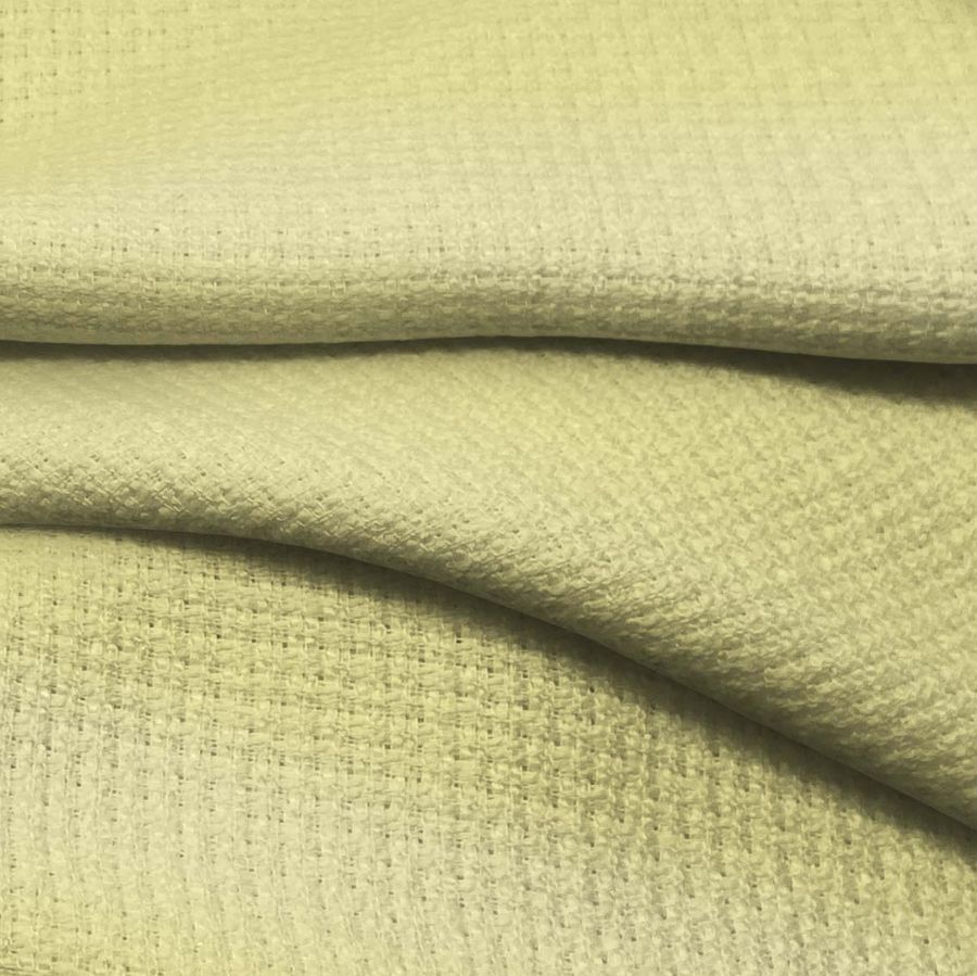 La tela base es Tweed Chanel, una tela de tipo tweed compuesta al 100% por poliéster con un gramaje de 420 gr/m2 y una anchura de 150 cm. El color liso impreso en la tela es amarillo-caqui, cuya tonalidad se logra mediante una mezcla de 8 de tinta cian, 2 de tinta magenta, 51 de tinta yellow y 0 de tinta black, lo que ofrece un efecto visual excepcional para cualquier prenda o decoración. Este color secundario es una mezcla de amarillo con un tono caqui más oscuro, que resulta muy versátil y fácil de combinar con otros colores, especialmente con negro, marrón, verde oliva y marrón claro.
