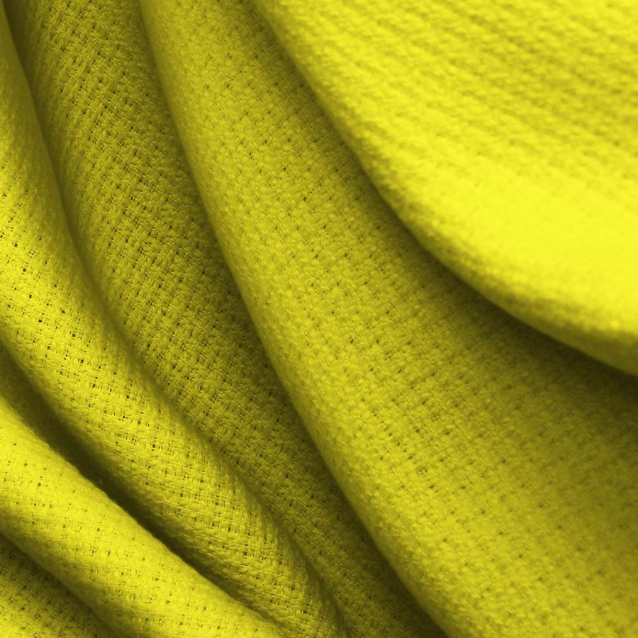 La tela base es Tweed Chanel, compuesta por 100% poliéster y con un gramaje de 420 gr/m2. Su ancho es de 150 cm y está disponible en un color liso impreso en amarillo canario, con una combinación de tintas de cian, magenta, amarillo y negro (CMYK: 14 4 90 0). Este color transmite calidez y energía, siendo perfecto para dar un toque alegre y luminoso a cualquier prenda o complemento. Además, el amarillo canario se combina muy bien con tonalidades más neutras como el beige, el blanco o el gris, así como con tonos análogos como el naranja, el verde o el amarillo mostaza.
