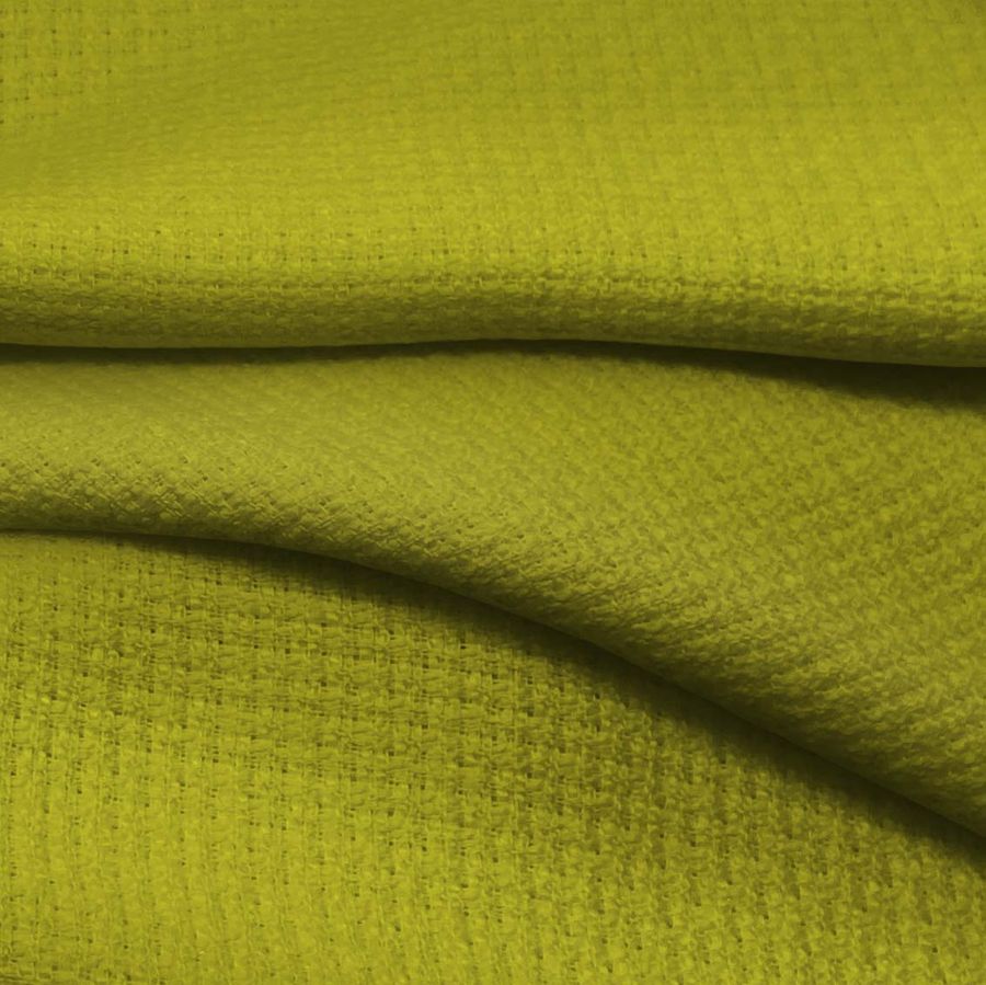 La tela base es un Tweed de Chanel de 420 gr/m2 y ancho de 150 cm, compuesto por 100% poliéster. El color liso impreso es un verde olivo cuyo CMYK es 41 27 99 11. Este color transmite tranquilidad y armonía, sugiere una conexión con la naturaleza y representa la esperanza y la sabiduría. El verde olivo combina muy bien con colores como el beige, el marrón, el blanco y el negro. Es importante mencionar que el tejido está impreso con el color liso a una sola cara por impresión digital textil.
