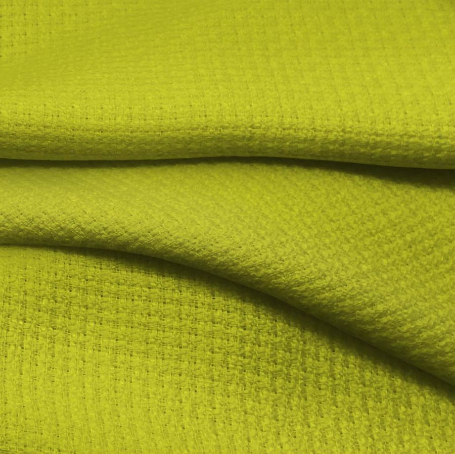 La tela base Tweed - Chanel es un tejido tipo tweed de composición 100% poliéster de 420 gr/m2 con un ancho de 150 cm. Su color liso impreso es un vibrante verde ácido reflejado en un perfil de color CMYK de 35 12 96 1. Este color secundario simboliza frescura, vitalidad y juventud. Combina perfectamente con tonos neutros como el blanco, gris y beige, así como con tonos cálidos como el amarillo y naranja.