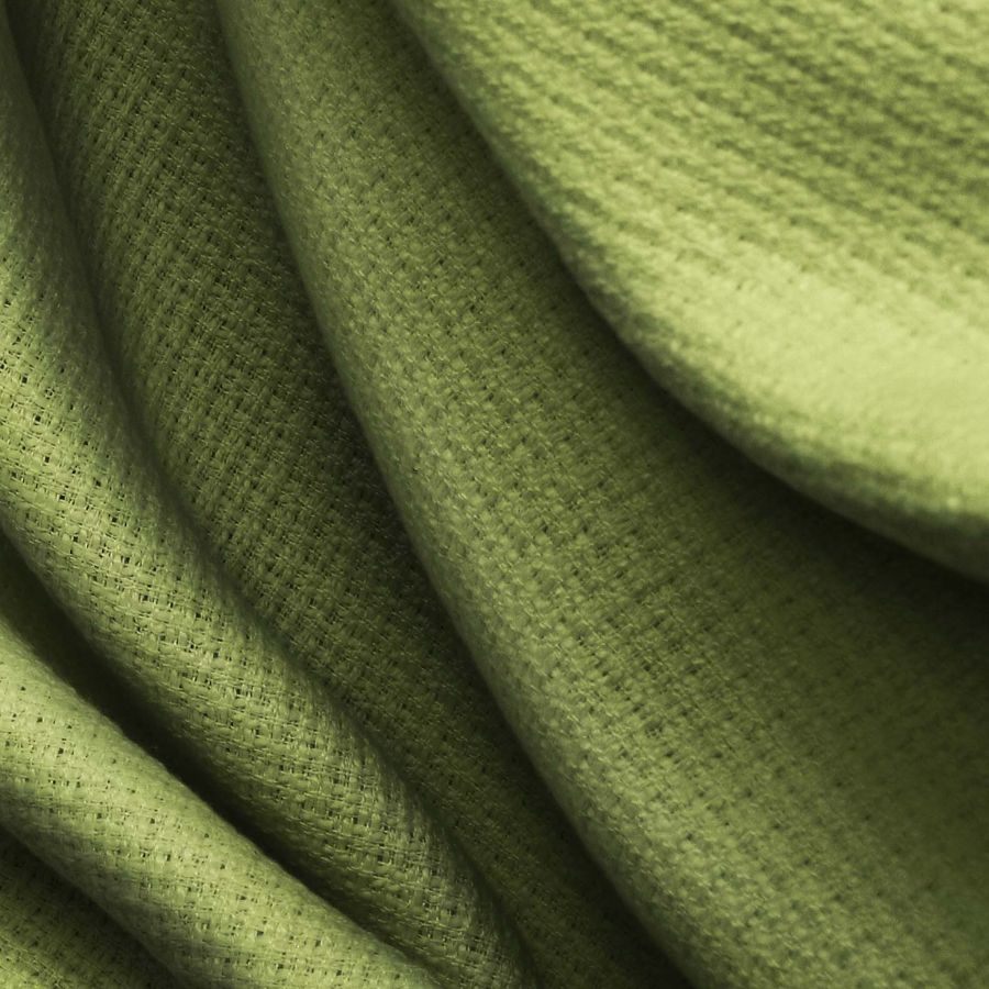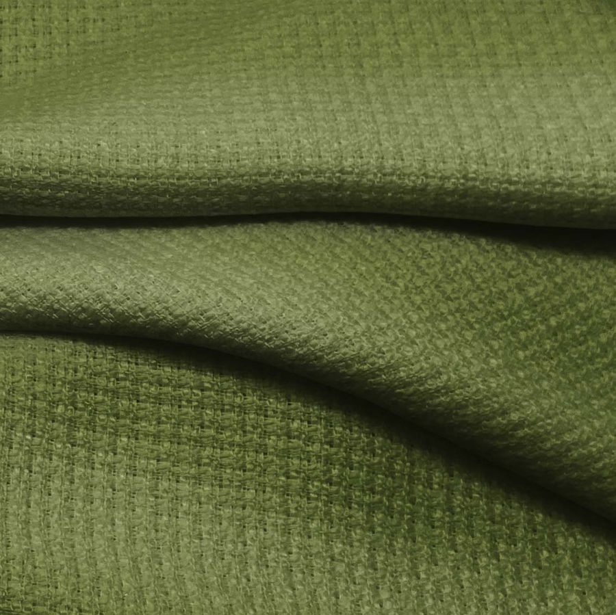 La tela base es un Tweed de Chanel, compuesta por 100% poliéster con un gramaje de 420 gr/m2 y un ancho de 150 cm. El color liso impreso en esta tela es verde oscuro o verde ejército, con una combinación de tinta cian de 62, magenta de 41, amarillo de 88 y negro de 34 (CMYK 62 41 88 34). El color verde ejército es un tono sofisticado y elegante que representa el equilibrio, la estabilidad y la seguridad. Combina especialmente bien con tonos como el tostado, el marrón, el beige y el blanco, otorgando a cualquier prenda confeccionada con él una sensación de naturalidad y armonía.