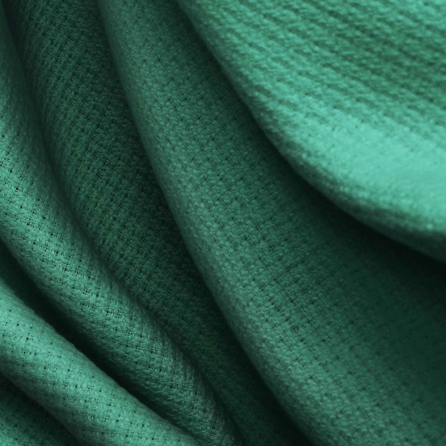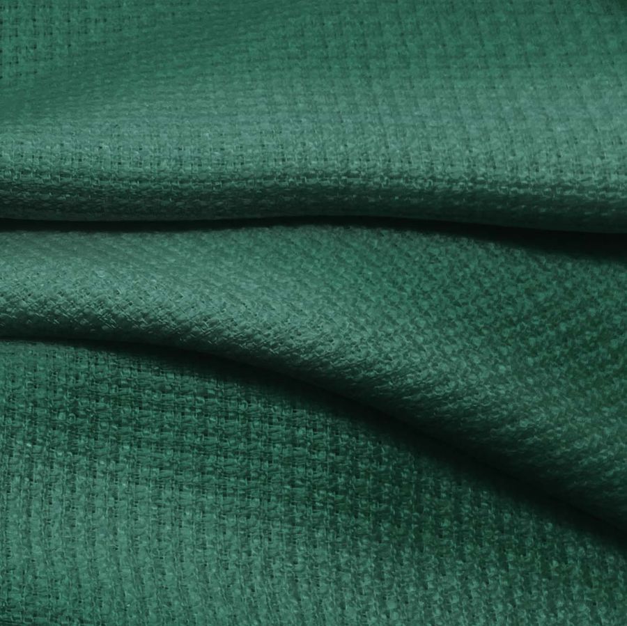 La tela base es Tweed - Chanel, un tejido de poliéster 100% con un gramaje de 420 gr/m2 y una anchura de 150 cm. El color liso impreso es un verde mar profundo, que se obtiene a través de la impresión digital textil con una tinta cyan del 84%, magenta del 40%, amarillo del 70% y negro del 42%, correspondiendo al CMYK del color liso. El verde mar profundo es un color simbólico que está asociado con la profundidad del mar y la naturaleza, y técnicamente, es un color frío que transmite serenidad y estabilidad. Combinado con otros colores como el blanco crea un contraste elegante, y con el gris oscuro o negro, se obtiene una armonía sofisticada.