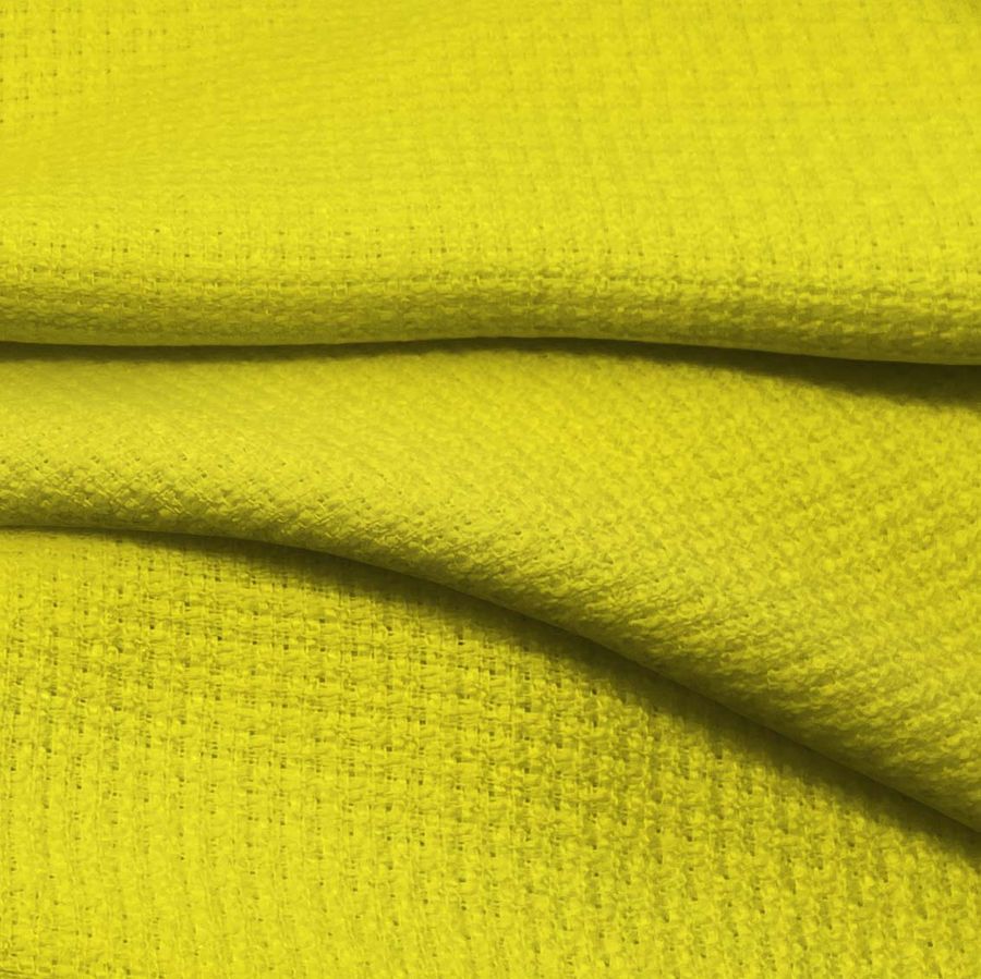 La tela base es un Tweed-Chanel, con una composición 100% poliéster y un gramaje de 420 gr/m2. El color liso impreso es un amarillo canario, con un CMYK de 10 0 89 0. Este color simboliza la luz, la energía y la alegría, y técnicamente se caracteriza por ser un color intenso y brillante. El amarillo canario combina particularmente bien con colores como el negro, el blanco, el gris o el marrón oscuro.