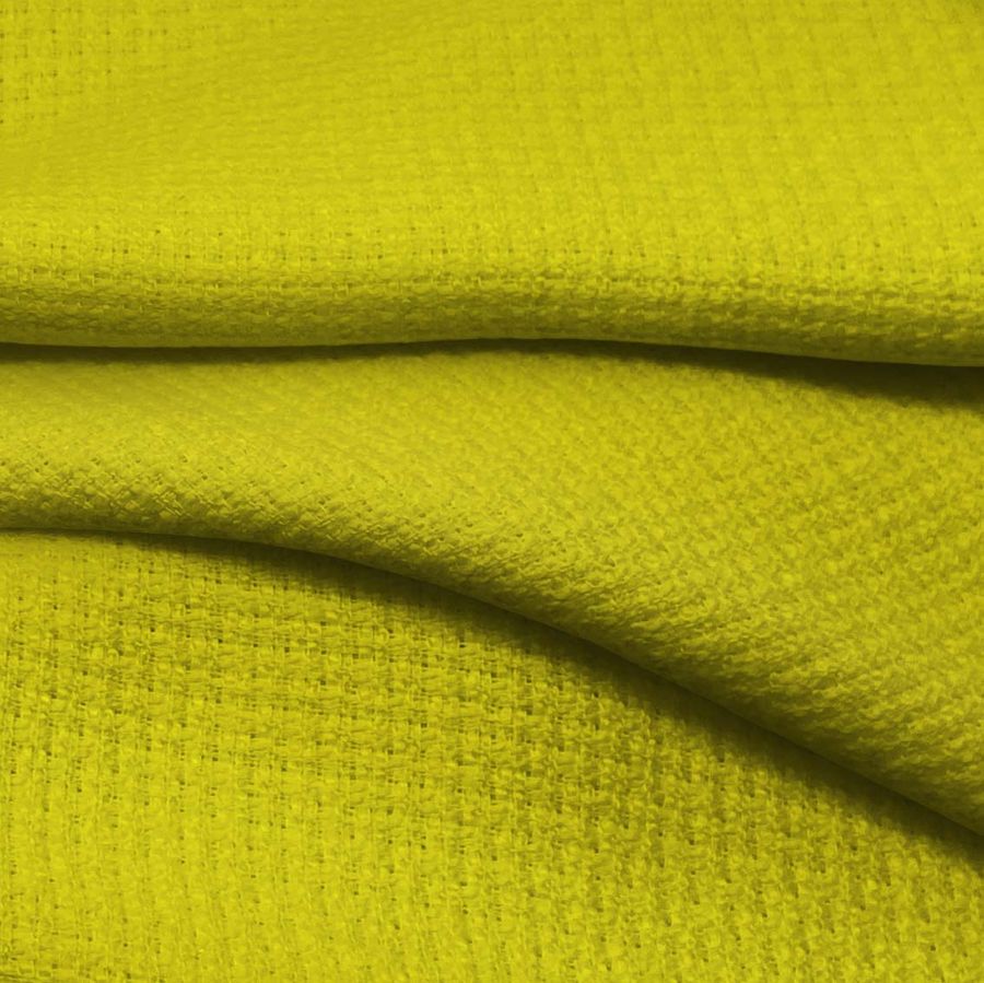 La tela base es Tweed - Chanel, un tejido de poliéster con un gramaje de 420 gr/m2 y un ancho de 150 cm. El color liso impreso en esta tela es Amarillo Plátano, que se compone de las siguientes cantidades de tinta: Cyan 24%, Magenta 13%, Yellow 96% y Black 2%. Este color se caracteriza por su tono cálido y vibrante, que transmite optimismo y energía. Combina muy bien con tonos neutros como el blanco, el gris y el negro, así como con tonos cálidos como el rojo y el naranja.