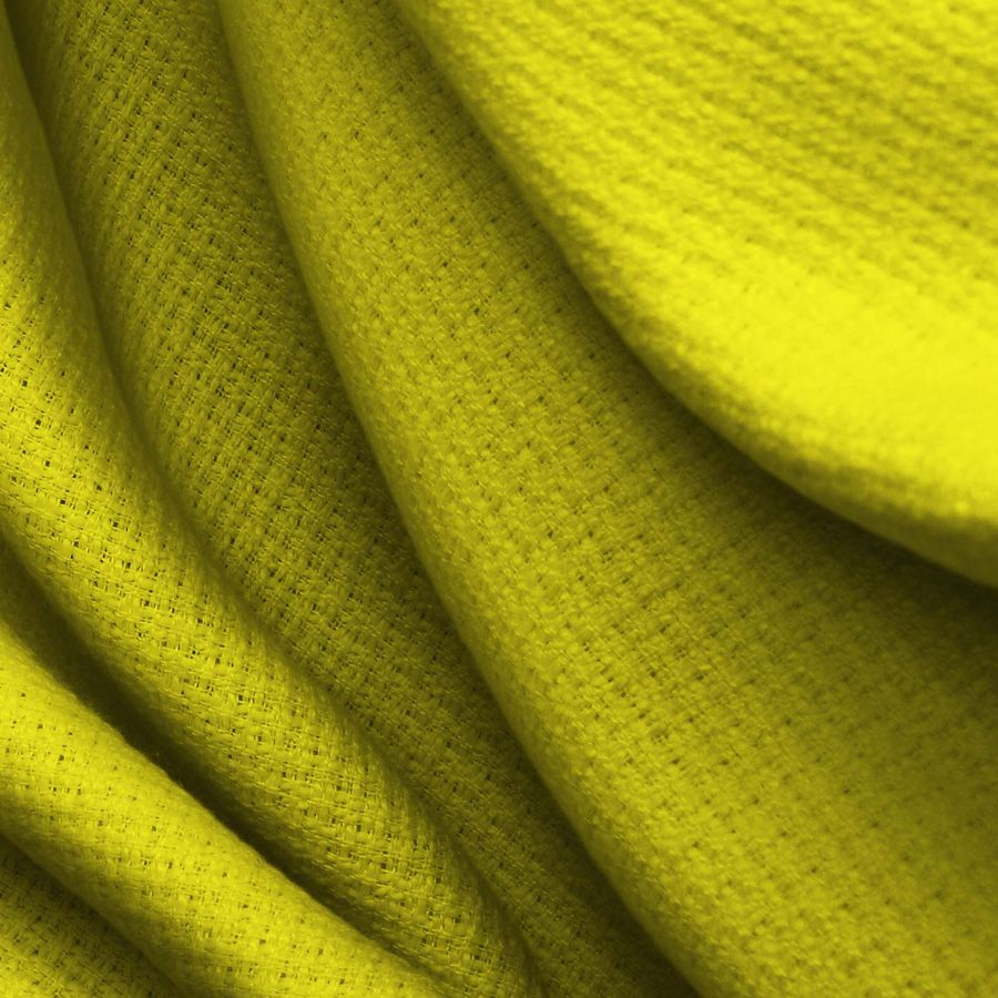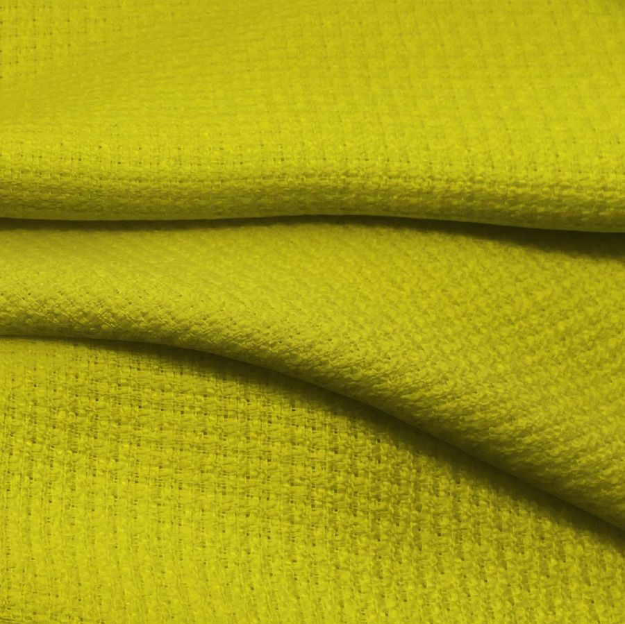 La tela base es un tejido Tweed-Chanel 100% poliéster de 420 gr/m2 y 150 cm de ancho. El color liso impreso es un vibrante verde ácido con un CMYK de 27 15 97 2, impreso a una sola cara por tecnología de sublimación. La tela presenta una textura rígida al tacto en una combinación de hilos entrelazados de colores contrastantes para crear un tradicional patrón de Tweed.