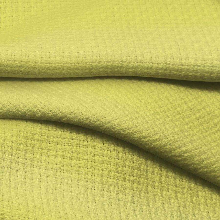 La tela base es el Tweed - Chanel, un tipo de tejido rígido compuesto 100% de poliéster, con un gramaje de 420 gr/m2 y un ancho de 150 cm. La tela es de color liso amarillo plátano, con una composición de tintas CMYK de 13% cian, 1% magenta, 70% amarillo y 0% negro. Este color es vibrante y luminoso, lo que lo hace perfecto para prendas o accesorios alegres y modernos. Además, combina bien con tonos neutros como el gris, el blanco y el negro.