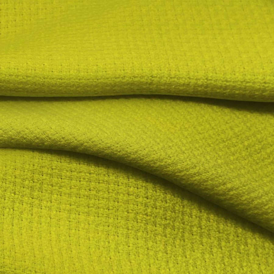 El Tweed - Chanel es una tela de tipo Tweed compuesta por un 100% de poliéster con un gramaje de 420 gr/m2 y un ancho de 150 cm. Su color liso impreso es el verde ácido con un CMYK de 31 13 96 2. Este color evoca a la naturaleza, la frescura y la juventud, y combina muy bien con otros tonos vivos como el amarillo, el rosa o el morado.