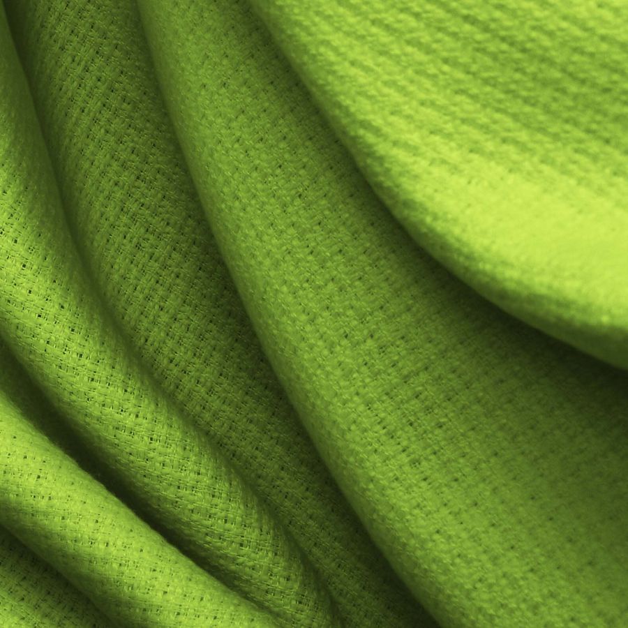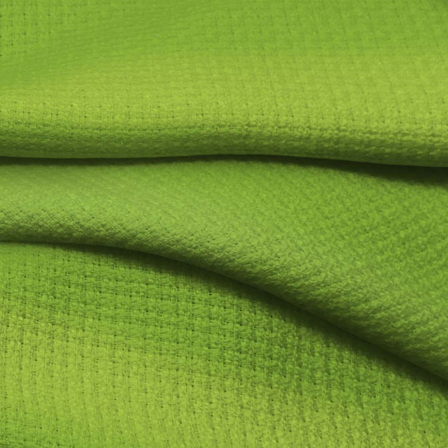 La tela base Tweed - Chanel de 100% poliéster tiene un gramaje de 420 gr/m2 y un ancho de 150 cm. El color liso impreso es un Verde cebolla con un CMYK de 56 9 94 1. Este color se describe como una tonalidad de verde amarillento parecido a la cebolla morada.