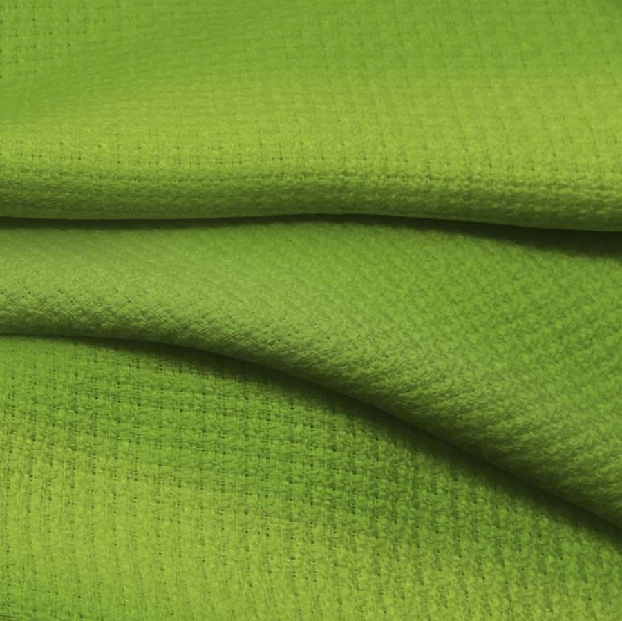 La tela base es Tweed-Chanel de 100% poliéster, con un gramaje de 420 gr/m2 y un ancho de 150 cm. El color liso impreso es Verde cebolla, con una tinta Cyan de 58, Magenta de 15, Yellow de 96 y Black de 2, con un CMYK de 58 15 96 2. Este color es una mezcla de verde con tonalidades claras de amarillo, transmitiendo una sensación de frescura, juventud y naturalidad. El color combina bien con tonos neutros como el gris y el blanco, así como con tonos rojizos y marrones.