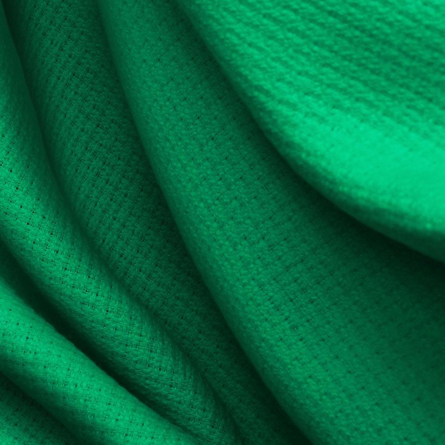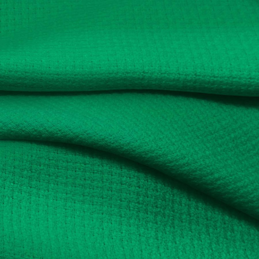 La tela base es el tweed Chanel, compuesta al 100% de poliéster con un gramaje de 420 gr/m2 y un ancho de 150 cm. El color liso impreso tiene una tonalidad verde SeaGreen con un CMYK de 84 19 82 4. Este color es un tono fresco y calmado que evoca a la naturaleza, el aire libre y la tranquilidad. Se combina especialmente bien con otros tonos de verde, tonalidades neutras y otros colores marinos como el azul oscuro.