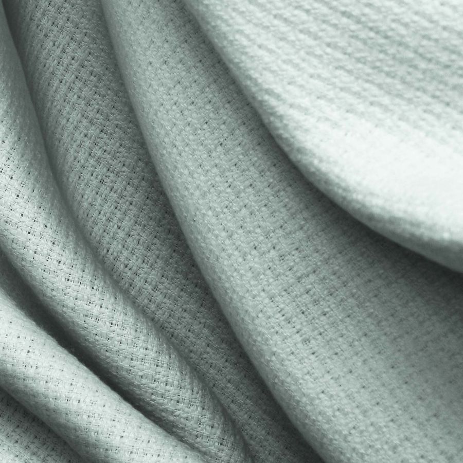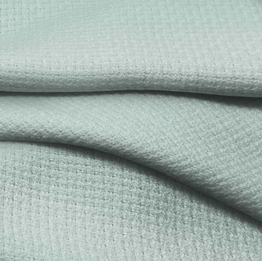 La tela base es un Tweed - Chanel compuesta al 100% de poliéster, con un gramaje de 420 gr/m2 y un ancho de 150 cm. El color liso impreso es un verde azuloso con una combinación de tinta cyan del 29%, magenta del 5%, yellow del 22% y black del 0%, representado por el valor CMYK de 29 5 22 0. Este tono evoca una sensación de serenidad y frescura, ideal para aplicaciones en prendas de vestir de mujer y hombre, como faldas, blazers o chaquetas. Combina a la perfección con otros tonos suaves como el beige, el crema o el rosa pastel.