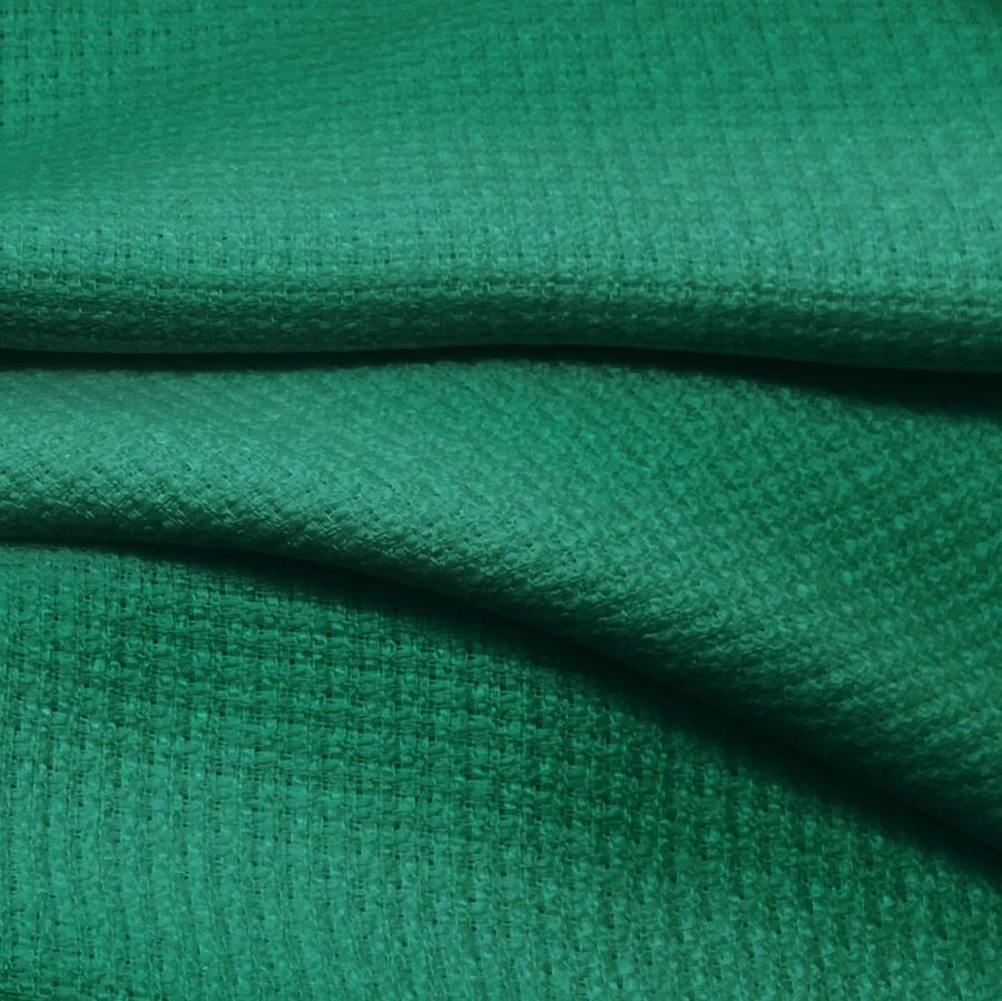 La tela base de este tejido es el Tweed - Chanel, compuesta por 100% poliéster, con un gramaje de 420 gr/m2 y una anchura de 150 cm. El color liso impreso es un Verde Mar Profundo, que se obtiene mediante la combinación de las tintas Cyan (88), Magenta (31), Yellow (74) y Black (22) en un proceso de impresión por sublimación. Este color simboliza la tranquilidad, la naturaleza y la estabilidad, y combina especialmente bien con tonos beige, marrones y crema.