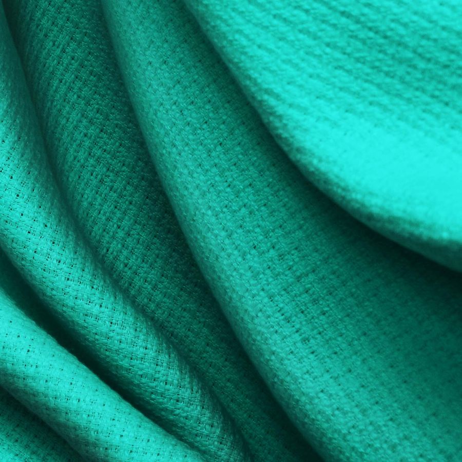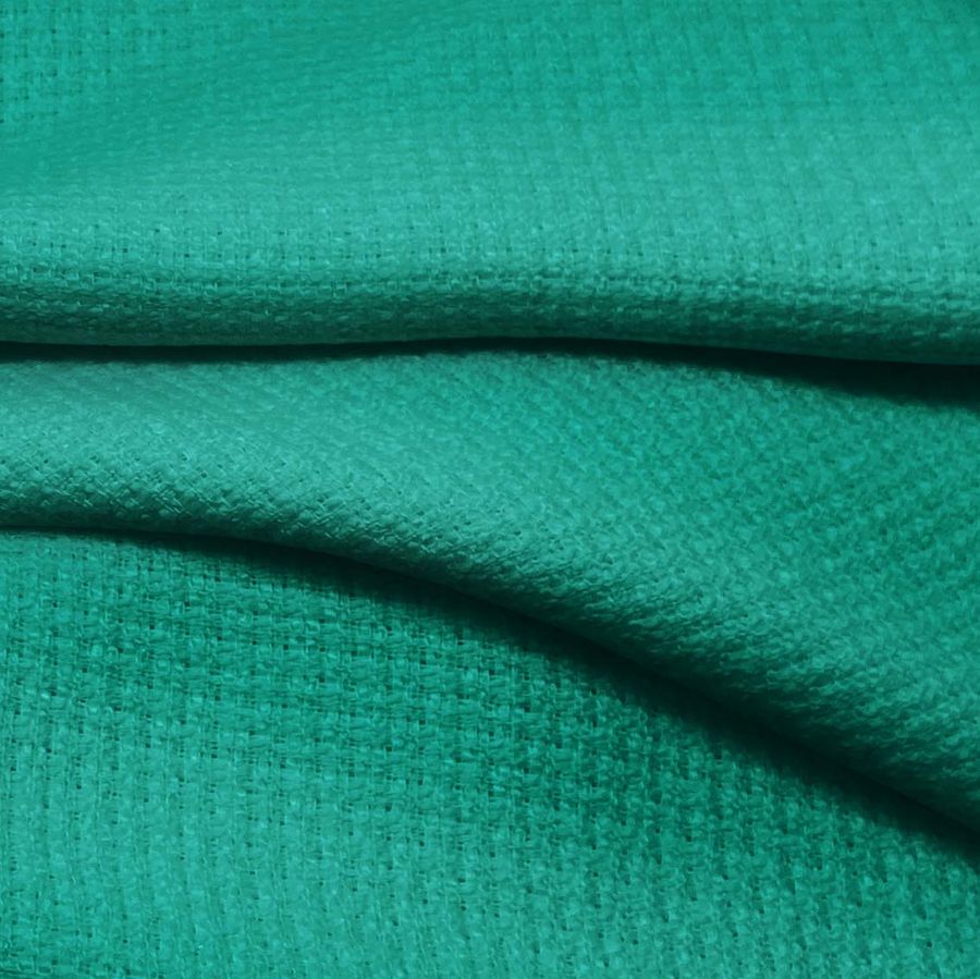 La tela base es el tweed Chanel, con una composición de 100% poliéster, un gramaje de 420 gr/m2 y un ancho de 150 cm. El color liso impreso es un verde menta oscuro con una combinación de tintas cyan, magenta, yellow y black con valores de 83, 21, 60 y 5, respectivamente. Este color representa un tono suave, fresco y elegante, y se combina perfectamente con tonos claros como el beige y el blanco, así como con tonos más oscuros como el gris y el marrón.