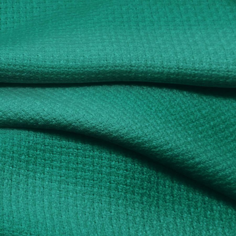 La tela base es Tweed - Chanel, compuesta al 100% de poliéster con un gramaje de 420 gr/m2 y un ancho de 150 cm. El color liso impreso es un verde menta oscuro, con un CMYK de 86 29 64 16. Este color simboliza la frescura y la pureza, mientras que técnicamente es un color que se obtiene al mezclar tintas cian, magenta, amarillo y negro en las proporciones indicadas. Combina especialmente bien con tonos grisáceos y neutros, aportando un contraste elegante y sofisticado.