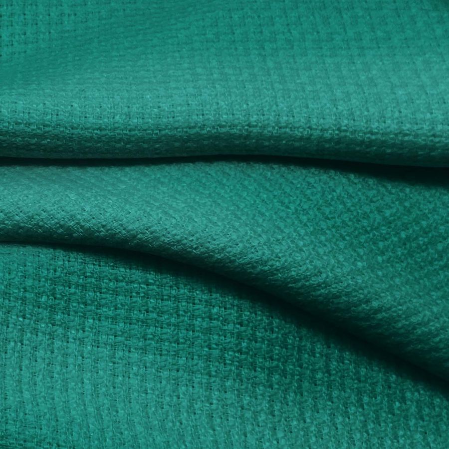 La tela base es Tweed - Chanel, con 100% poliéster y un gramaje de 420 gr/m2. El color liso impreso es un verde menta oscuro, con un CMYK de 87 32 61 23. Este color evoca la naturaleza y la armonía. Combina perfectamente con colores pastel y tonos tierra para crear un ambiente sereno y elegante.