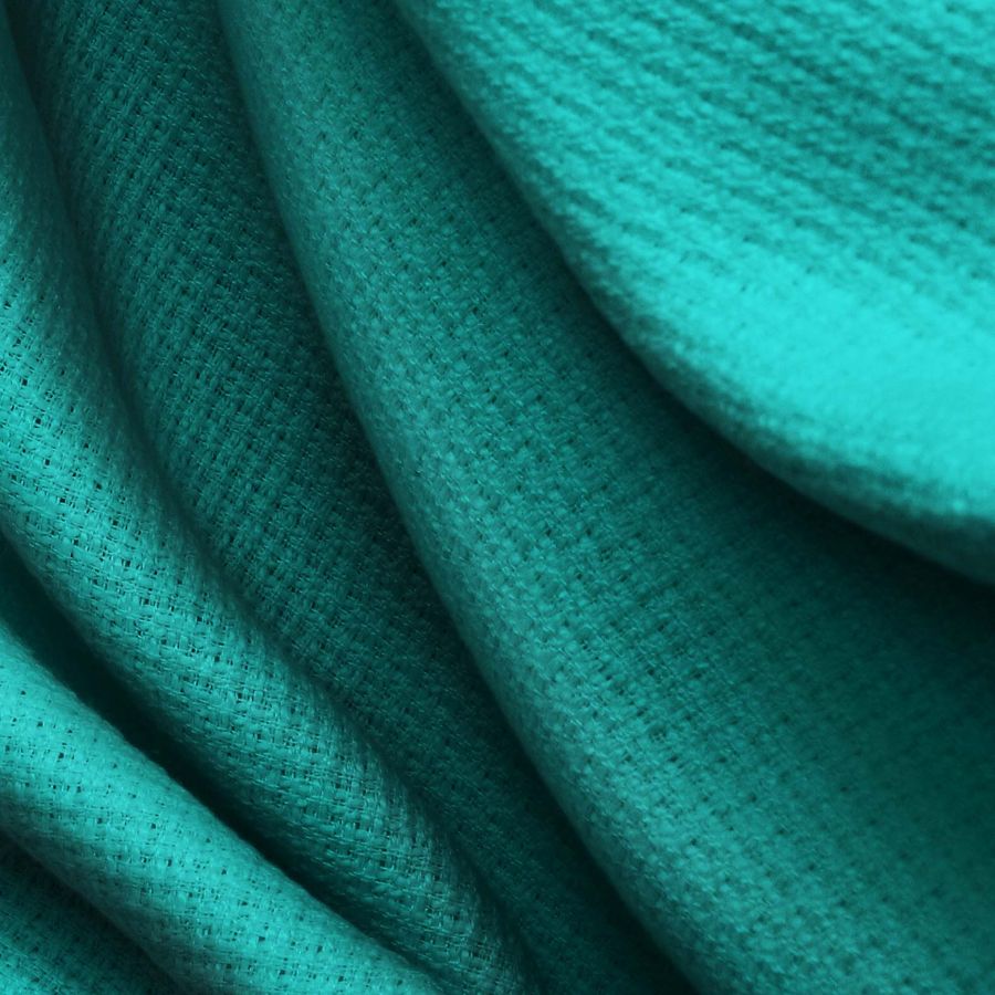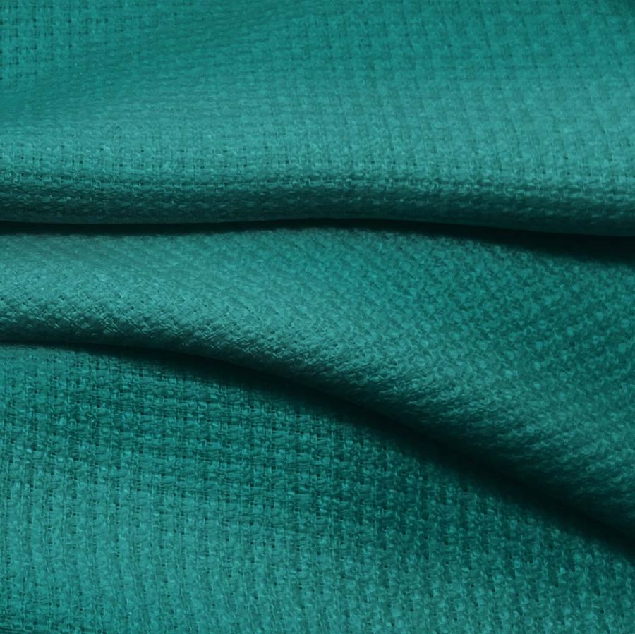 La tela base Tweed-Chanel es una mezcla de poliéster de 420 gr/m2 que se imprime en un hermoso verde azulado medio. El CMYK del color liso es de 87 34 56 26, y se combina fácilmente con tonos tierras y oxidados, marrones y amarillos mostaza.