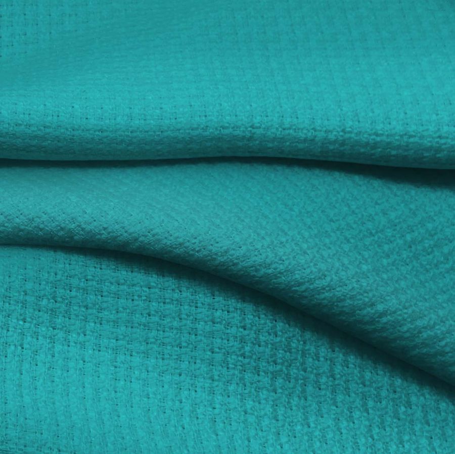 La tela base es el Tweed - Chanel, una tela de tipo tweed con composición 100% poliéster, gramaje de 420 gr/m2 y ancho de 150 cm. El color liso impreso es Verde DarkCyan, con un CMYK de 77 17 39 2. Este tono evoca la naturaleza con su verdor oscuro y sus matices azulados. Combina armoniosamente con tonos tierra, beige, gris y blanco. Es importante mencionar que la tela está impresa con el color liso a una sola cara por impresión digital textil.