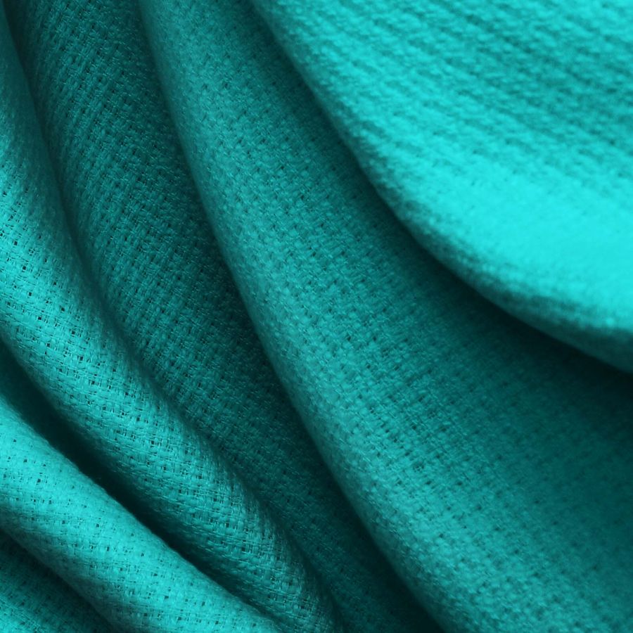 La tela base es un Tweed Chanel, compuesta al 100% por poliéster y con un gramaje de 420 gr/m2. Su color liso impreso es un verde azulado medio con un CMYK de 85 30 50 17. Este color simboliza la armonía, la estabilidad y la seguridad, técnicamente es un color frío y calmado. Complementa muy bien con tonos neutros como el gris y el beige, así como con colores vibrantes como el amarillo, el naranja y el rojo.
