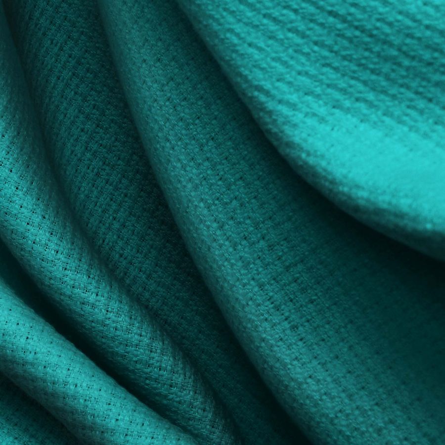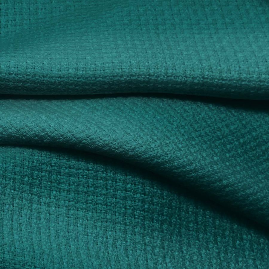 La tela base es el Tweed Chanel, un tejido con textura rígida compuesto por 100% poliéster que tiene un gramaje de 420 gr/m2 y una anchura de 150 cm. El color liso impreso es una mezcla de verde y verde azulado medio, con una composición de tinta CMYK de 89 40 56 40. Este color en particular combina muy bien con tonos marrones y beige, lo que hace de esta tela una gran elección para ropa de otoño/invierno.